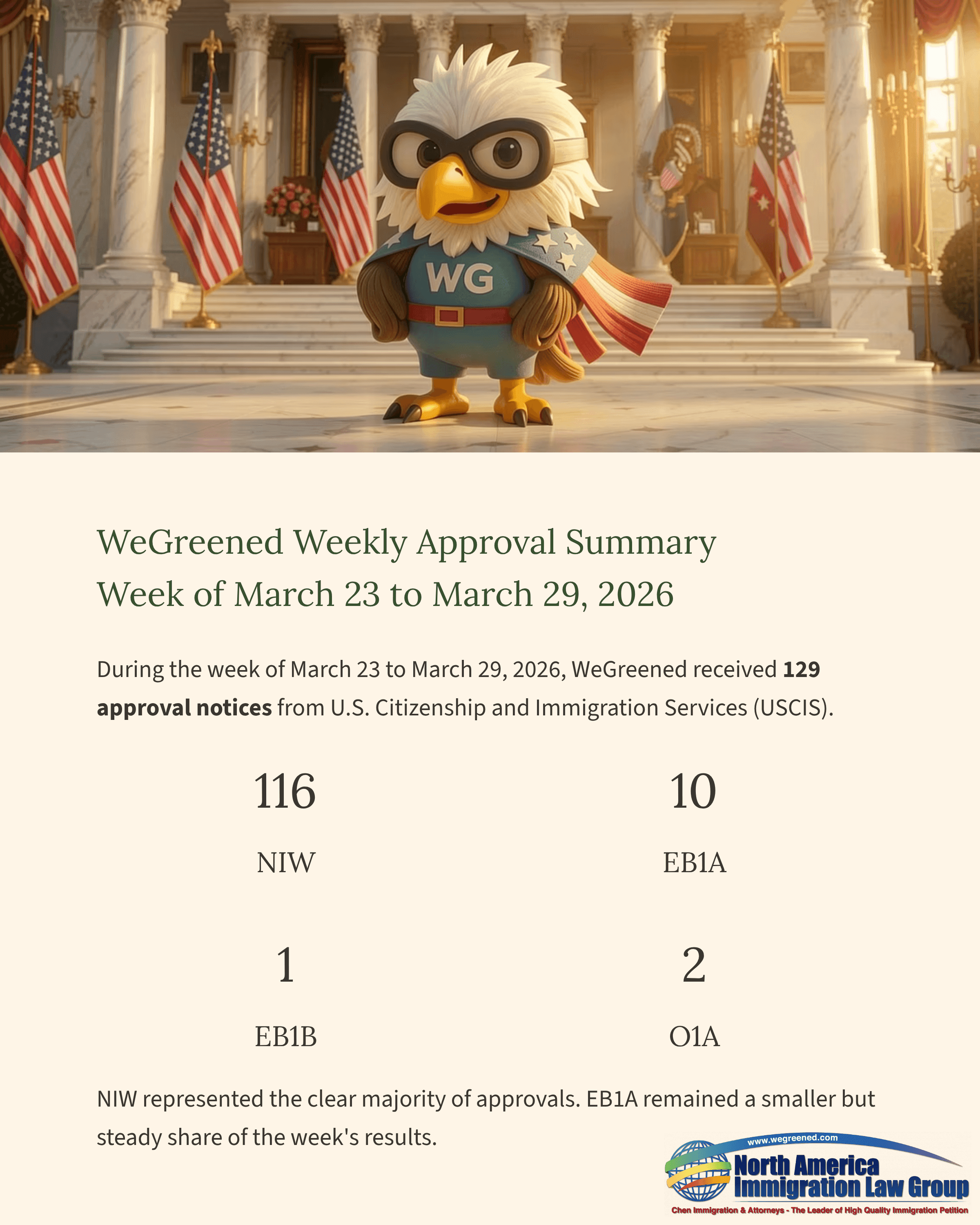 During the week of March 23 to March 29, 2026, WeGreened received 129 approval notices from U.S. Citizenship and Immigration Services (USCIS). Of the 129 approvals, 116 were for NIW (National Interest Waiver), 10 were for EB1A (Alien of Extraordinary Ability), 1 was for EB1B (Outstanding Professors or Researchers), and 2 were for O1A (Individuals with Extraordinary Ability or Achievement).