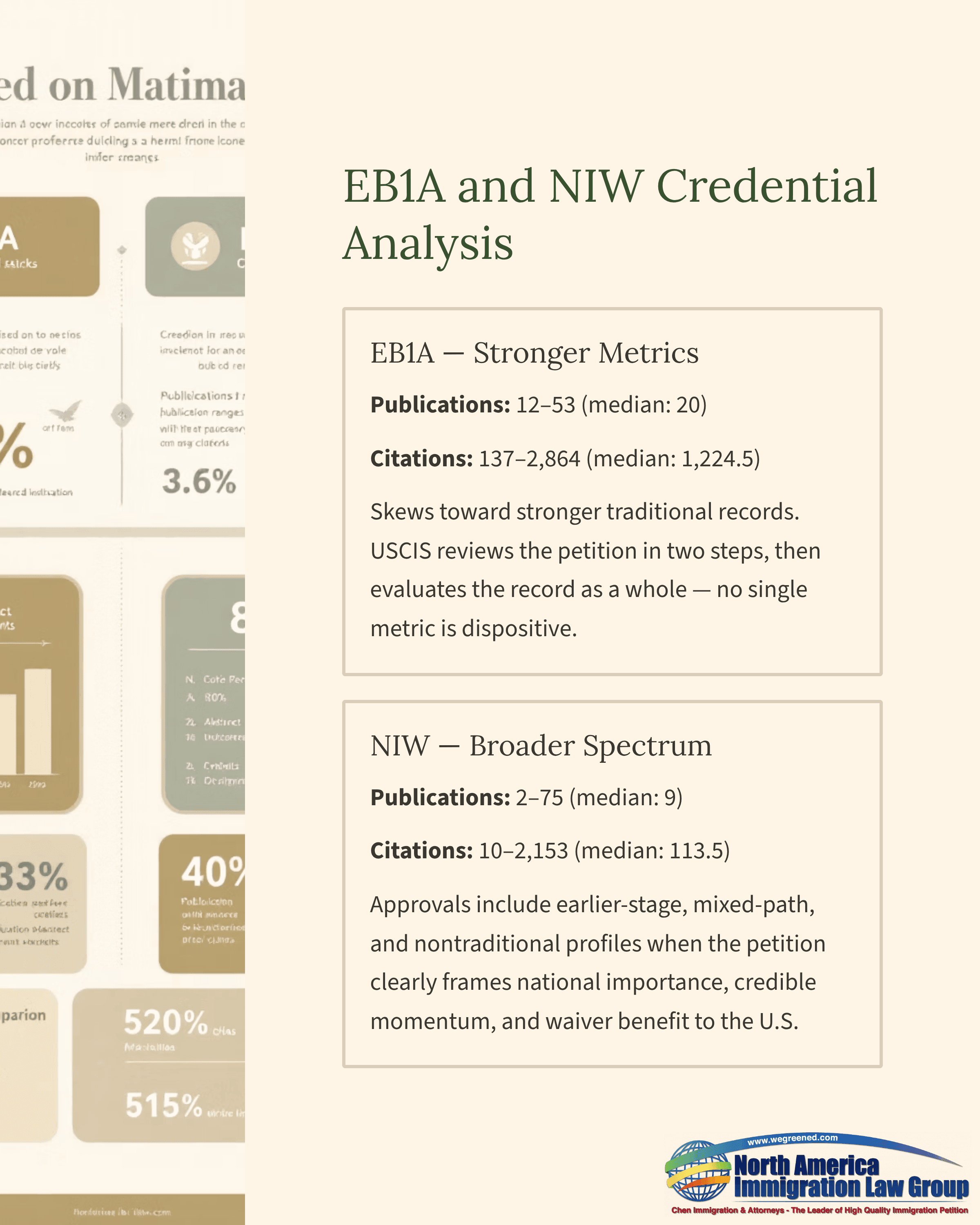 EB1A petitioners this week showed concentrated but still varied impact metrics. Publications ranged from 12 to 53 (Q1: 14, median: 20, Q3: 32.25), and citations ranged from 137 to 2,864 (Q1: 710.75, median: 1,224.5, Q3: 1,955). That profile is consistent with a category that still skews toward stronger traditional records overall, but where current USCIS guidance makes clear that officers ultimately review the petition in two steps and then evaluate the record as a whole at final merits, rather than treating any single metric as dispositive.NIW petitioners again reflected a much broader spectrum of credential profiles. Publications ranged from 2 to 75 (Q1: 6, median: 9, Q3: 14), and citations ranged from 10 to 2,153 (Q1: 44.5, median: 113.5, Q3: 280.25). Compared with EB1A, NIW again showed a broader spread across both publications and citations, reinforcing the point that approvals can include earlier-stage, mixed-path, and nontraditional profiles when the petition clearly frames national importance, shows credible momentum, and explains why waiver flexibility benefits the United States.