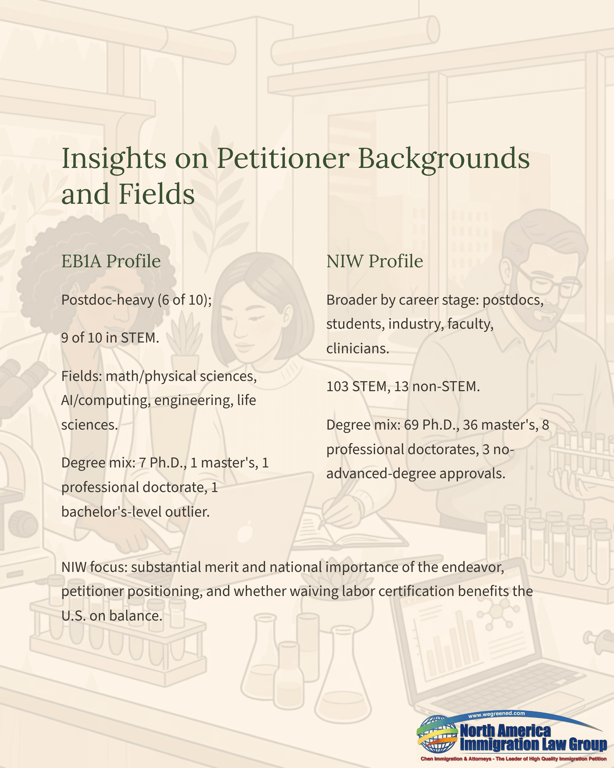 EB1A approvals this week were postdoc-heavy and clustered most visibly in math- and physical-science-facing work, with additional approvals across AI/computing, engineering, life sciences, and clinically oriented work. Employment backgrounds were mixed but still tilted toward research-intensive profiles: six postdocs, two industry professionals, one faculty member, and one student/trainee record. EB1A also remained heavily STEM-oriented, with 9 of 10 approvals in STEM fields. The degree mix was still Ph.D.-heavy, with 7 Ph.D. holders, 1 master’s-level petitioner, 1 professional doctorate, and 1 bachelor’s-level industry-facing outlier. That mix suggests that EB1A remained strongest where the file could present a record of sustained recognition at a relatively high level, regardless of whether the petitioner was in academia or industry.NIW approvals were again broader by both career stage and field. Postdocs formed the largest employment group, but the week also included a substantial student/candidate share, a meaningful industry share, faculty cases, research staff, and a smaller clinician group. By field grouping, AI/computing/electrical-engineering-adjacent work and engineering together accounted for nearly half the NIW approvals, with additional strength in biomedical/public-health work, life sciences, math/physical sciences, and a smaller but real social-science/education presence. NIW also remained heavily STEM-weighted, with 103 STEM and 13 non-STEM approvals, while showing a wider degree mix that included 69 Ph.D. holders, 36 master’s-level petitioners, 8 professional doctorates, and 3 approvals flagged as no-advanced-degree cases. That distribution fits the way USCIS currently describes NIW analysis: the focus is not the prestige of a title by itself, but whether the proposed endeavor has substantial merit and national importance, whether the petitioner is well positioned to advance it, and whether waiving the labor-certification process would benefit the country on balance.