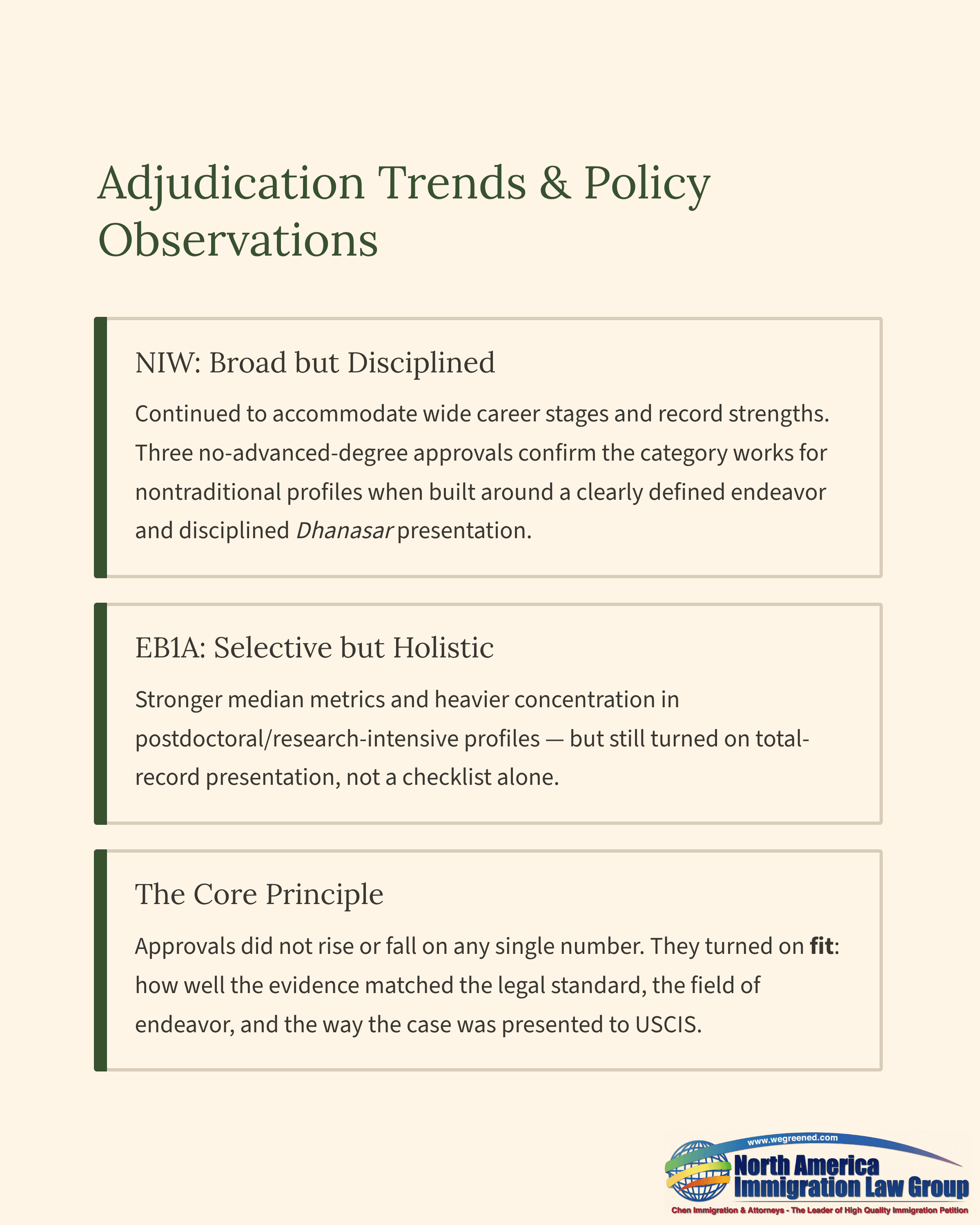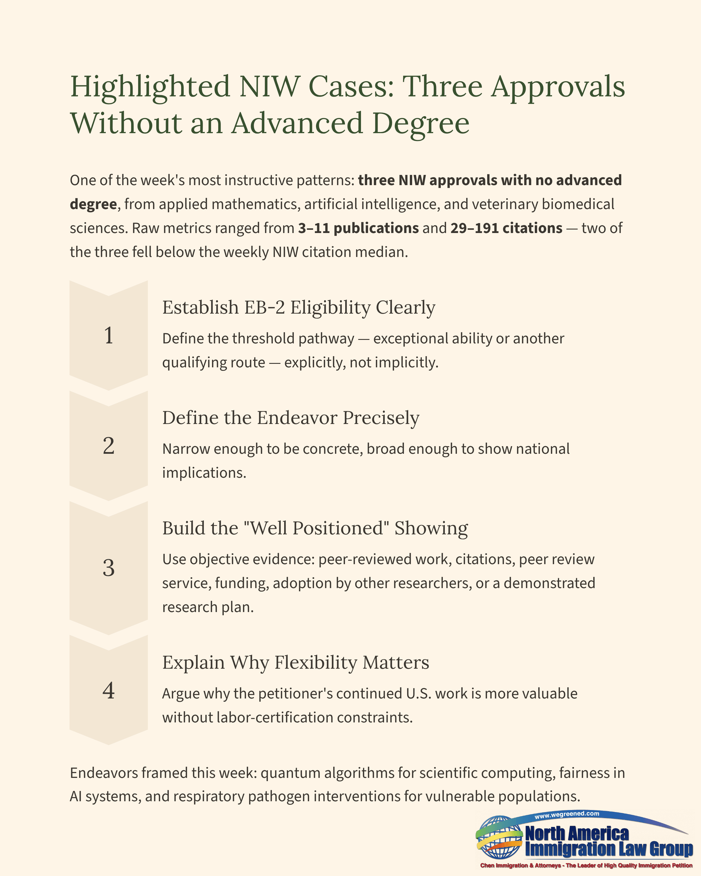 One of the most instructive patterns in this week’s data was the presence of three NIW approvals flagged as no-advanced-degree filings. The three profiles came from applied mathematics, artificial intelligence, and veterinary biomedical sciences. Their records were not identical, but together they show that a nontraditional NIW can still succeed when the petition is organized around the right theory of the case rather than around degree level alone. In raw metrics, these three approvals ranged from 3 to 11 publications and from 29 to 191 citations. That puts two of the three below the NIW median on citations this week, which is precisely why the underlying strategy matters.The common strategic lesson from the attached petition letters is not that USCIS ignores threshold eligibility, but that nontraditional NIW filings need a particularly disciplined structure. In practice, the strongest versions of these cases do four things well. First, they establish the underlying EB-2 eligibility pathway clearly, whether through exceptional ability or another qualifying route, instead of leaving the threshold theory implicit. Second, they define the proposed endeavor narrowly enough to be concrete but broadly enough to show national implications. Third, they build the “well positioned” showing through objective evidence already in the record such as peer-reviewed work, citations, peer review service, memberships, adoption by other researchers, funding support, or a demonstrated research plan. Fourth, they explain why flexibility matters: why the person’s continued U.S. work would be more valuable if it were not constrained by the labor-certification framework.