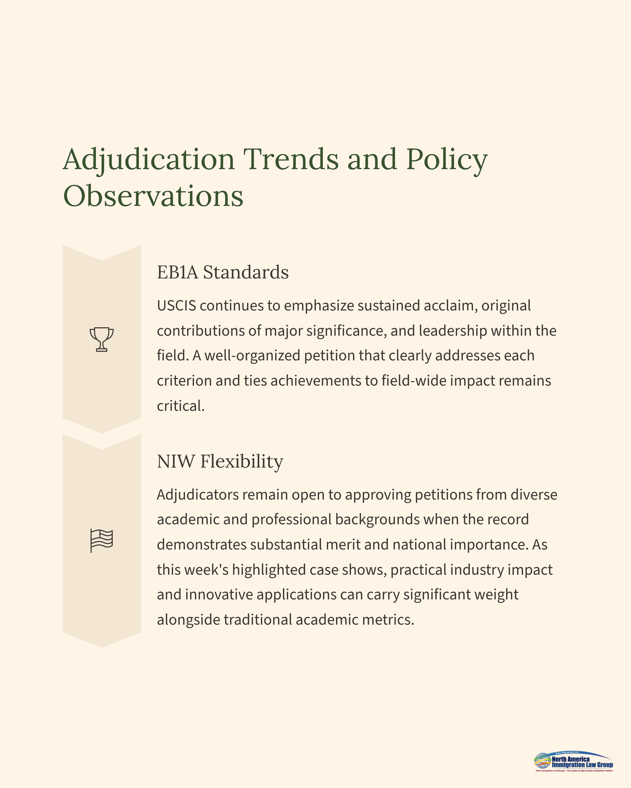 EB1A: USCIS continues to emphasize sustained acclaim, original contributions of major significance, and leadership within the field. A well-organized petition that clearly addresses each criterion and ties achievements to field-wide impact remains critical.