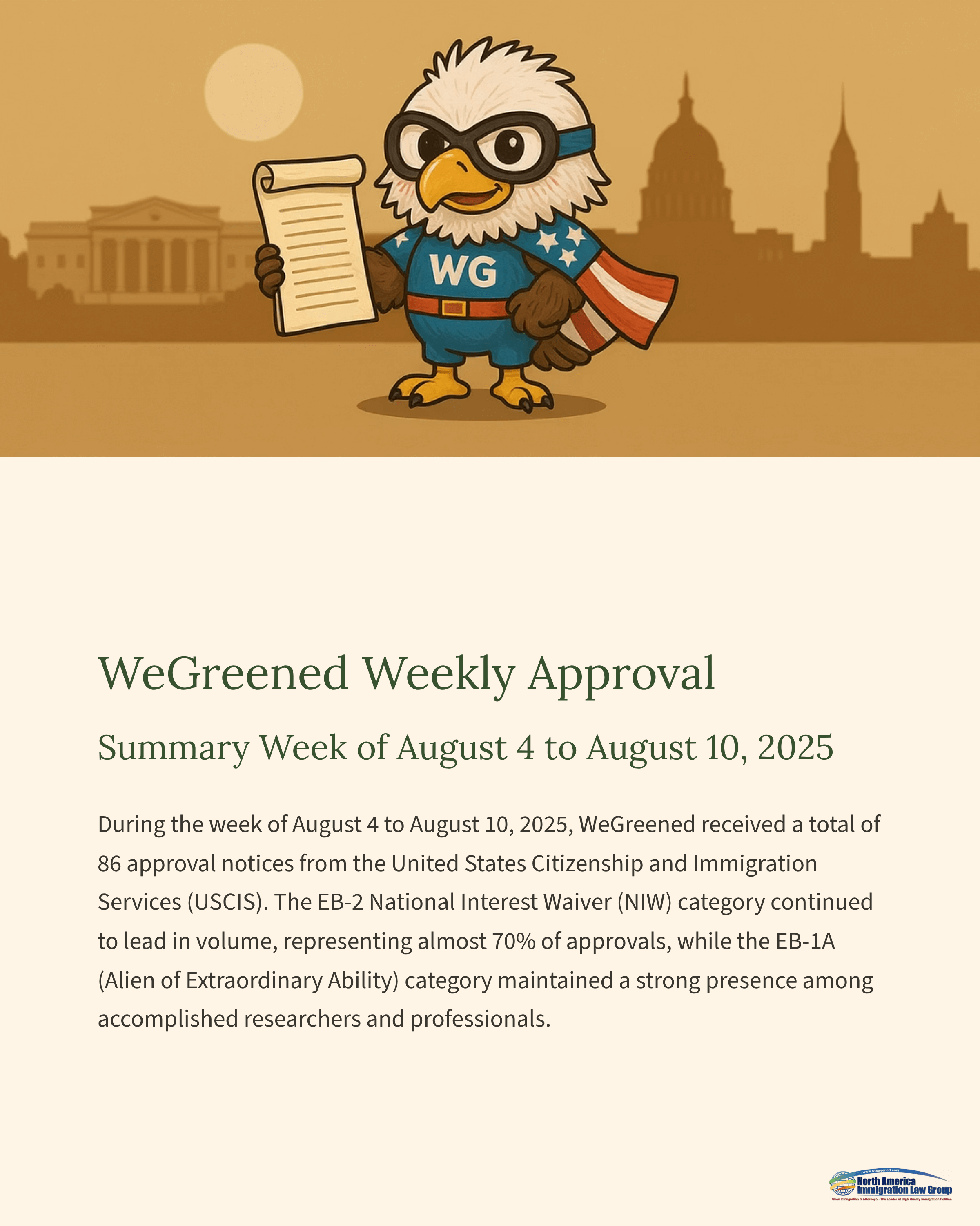 During the week of August 4 to August 10, 2025, WeGreened received a total of 86 approval notices from the United States Citizenship and Immigration Services (USCIS). The EB-2 National Interest Waiver (NIW) category continued to lead in volume, representing almost 70% of approvals, while the EB-1A (Alien of Extraordinary Ability) category maintained a strong presence among accomplished researchers and professionals.