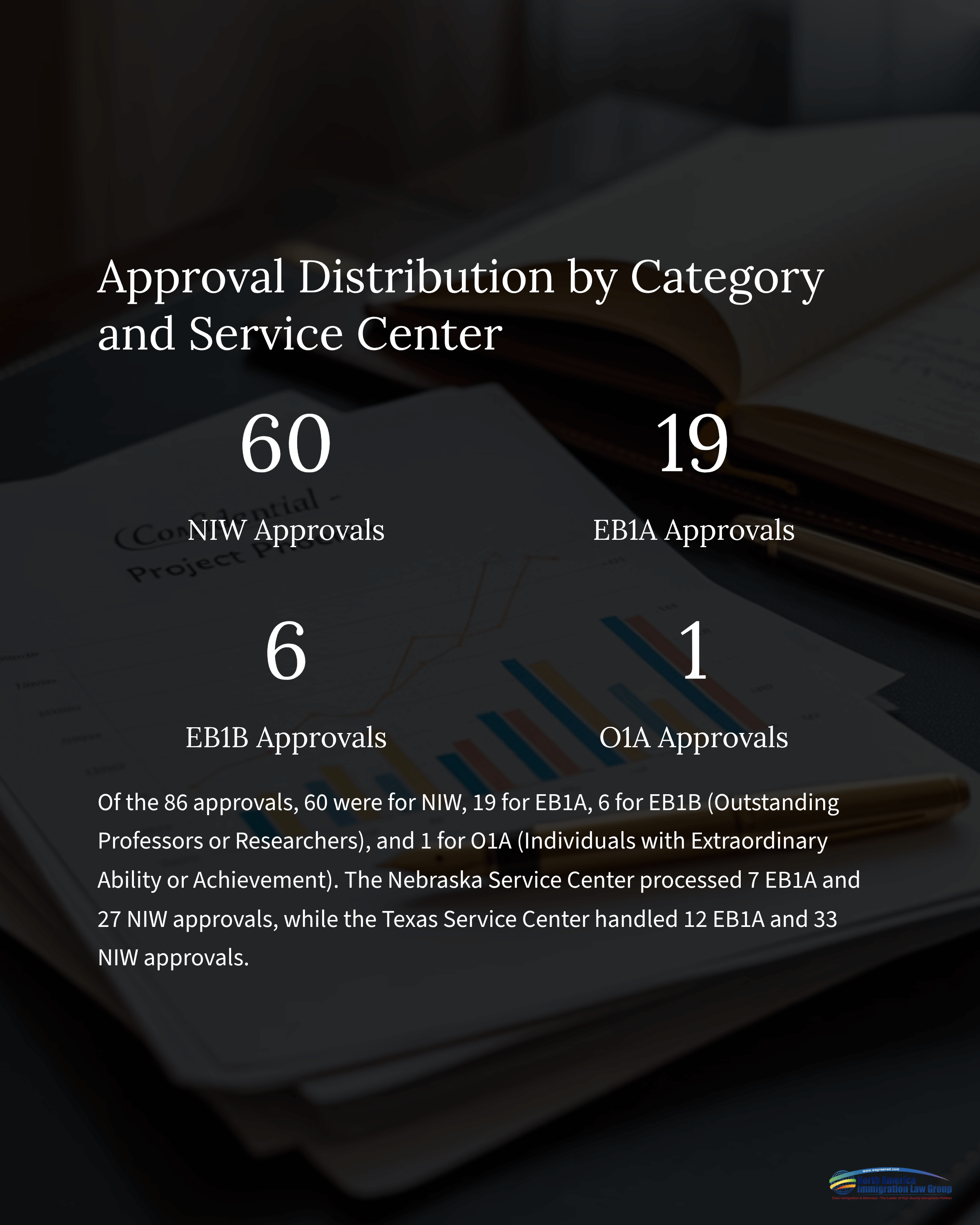 Of the 86 approvals, 60 were for NIW, 19 for EB1A, 6 for EB1B (Outstanding Professors or Researchers), and 1 for O1A (Individuals with Extraordinary Ability or Achievement). The Nebraska Service Center processed 7 EB1A and 27 NIW approvals, while the Texas Service Center handled 12 EB1A and 33 NIW approvals.
