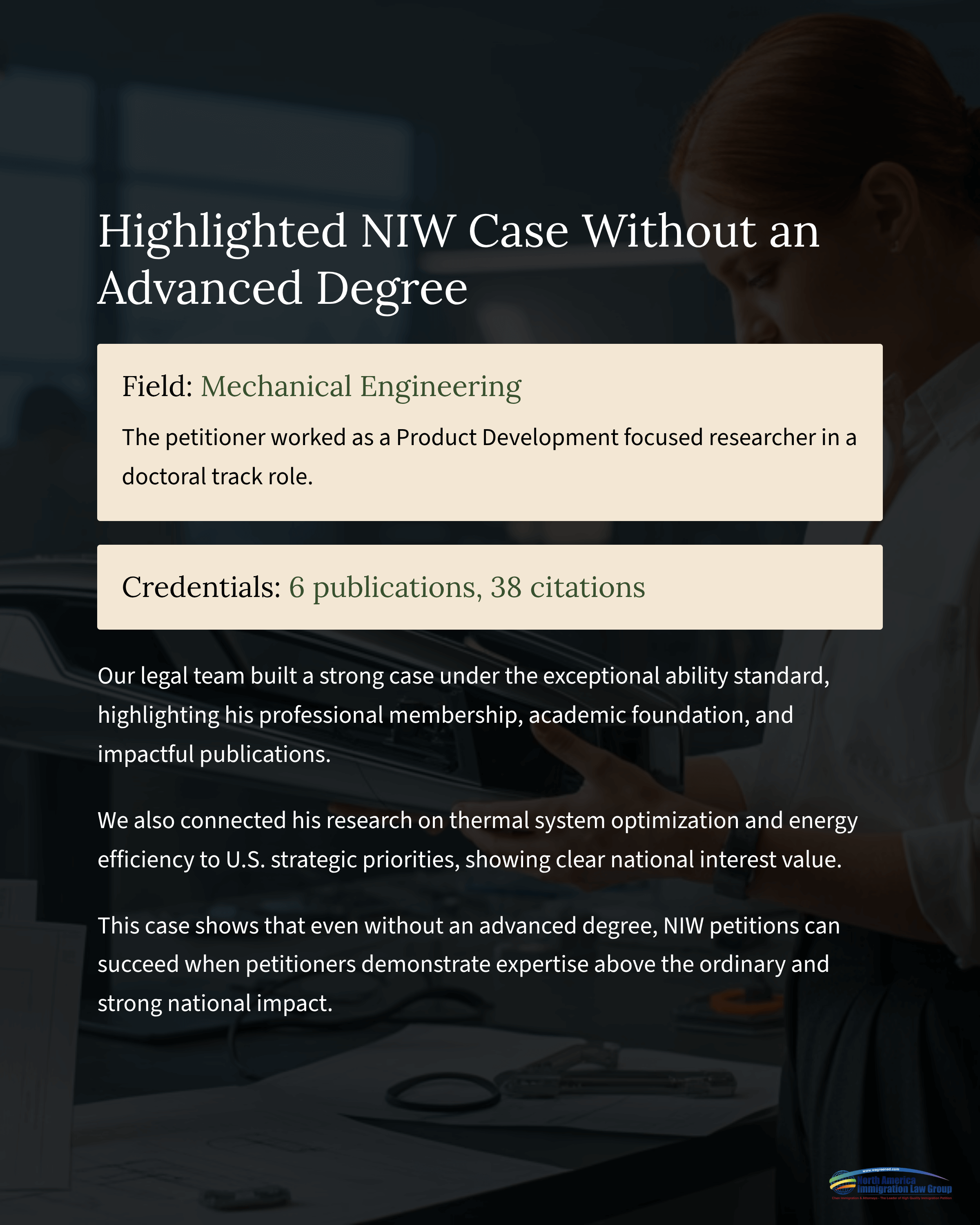 This case highlights USCIS’s willingness to approve NIW petitions for individuals without advanced degrees when their record shows technical expertise significantly above that ordinarily encountered and a clear potential to advance U.S. national interest.