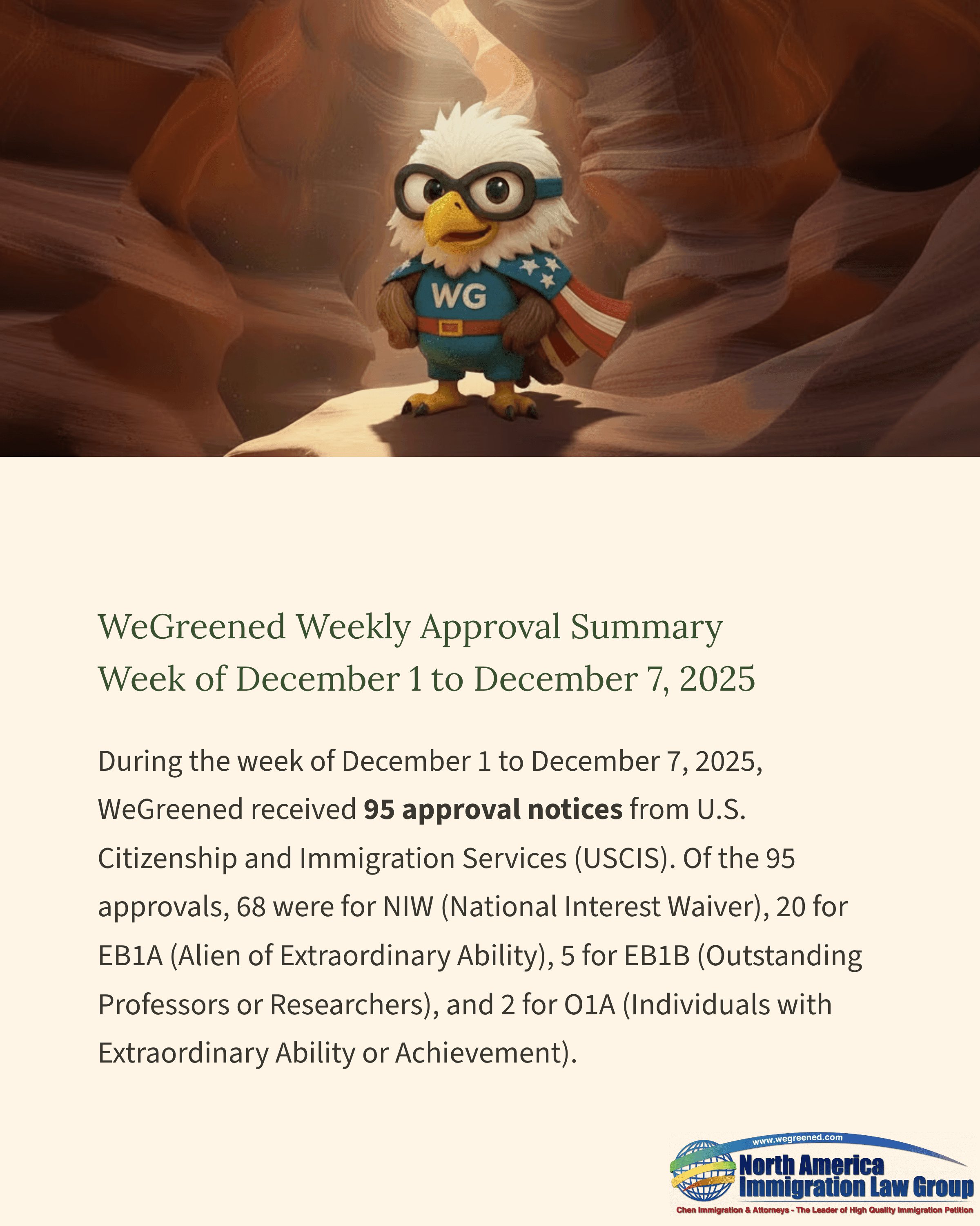 During the week of December 1 to December 7, 2025, WeGreened received 95 approval notices from U.S. Citizenship and Immigration Services (USCIS). Of the 95 approvals, 68 were for NIW (National Interest Waiver), 20 for EB1A (Alien of Extraordinary Ability), 5 for EB1B (Outstanding Professors or Researchers), and 2 for O1A (Individuals with Extraordinary Ability or Achievement). The EB-2 NIW category again represented the majority of approvals, while the EB-1A category maintained a strong presence among accomplished researchers, clinicians, and industry professionals.