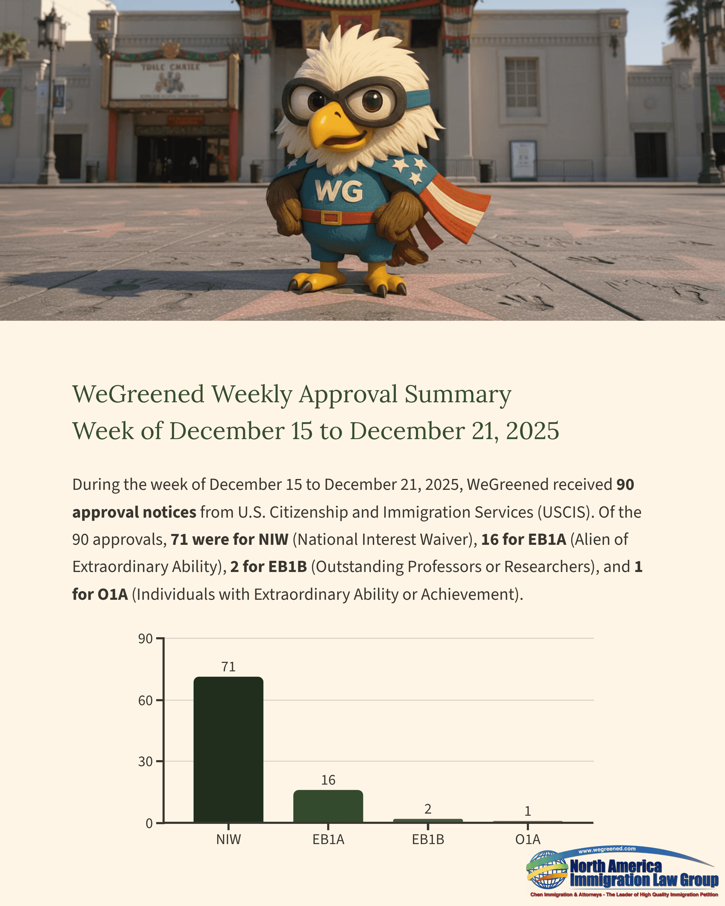 During the week of December 15 to December 21, 2025, WeGreened received 90 approval notices from U.S. Citizenship and Immigration Services (USCIS). Of the 90 approvals, 71 were for NIW (National Interest Waiver), 16 for EB1A (Alien of Extraordinary Ability), 2 for EB1B (Outstanding Professors or Researchers), and 1 for O1A (Individuals with Extraordinary Ability or Achievement).