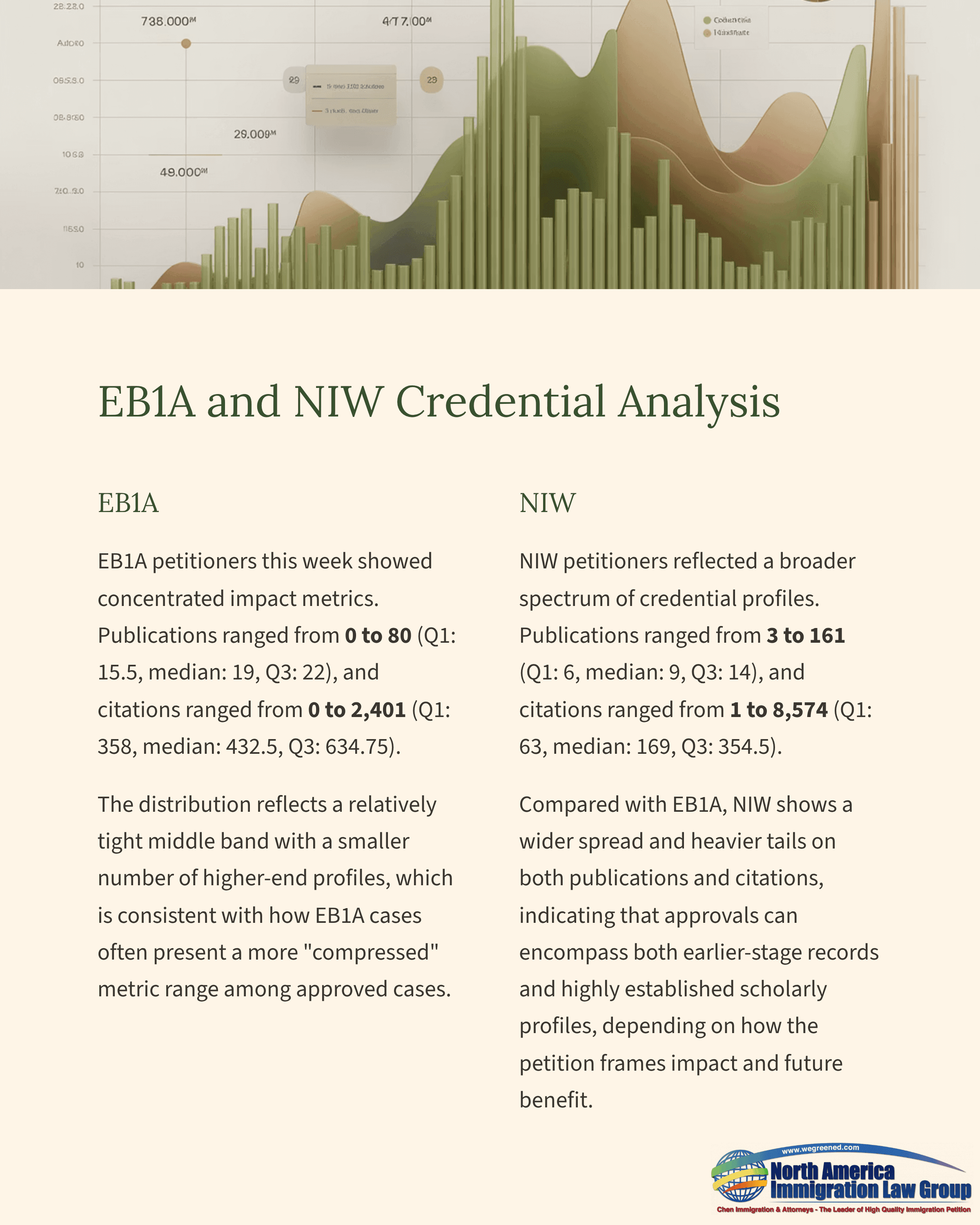 NIW petitioners reflected a broader spectrum of credential profiles. Publications ranged from 3 to 161 (Q1: 6, median: 9, Q3: 14), and citations ranged from 1 to 8,574 (Q1: 63, median: 169, Q3: 354.5). Compared with EB1A, NIW shows a wider spread and heavier tails on both publications and citations, indicating that approvals can encompass both earlier-stage records and highly established scholarly profiles, depending on how the petition frames impact and future benefit.