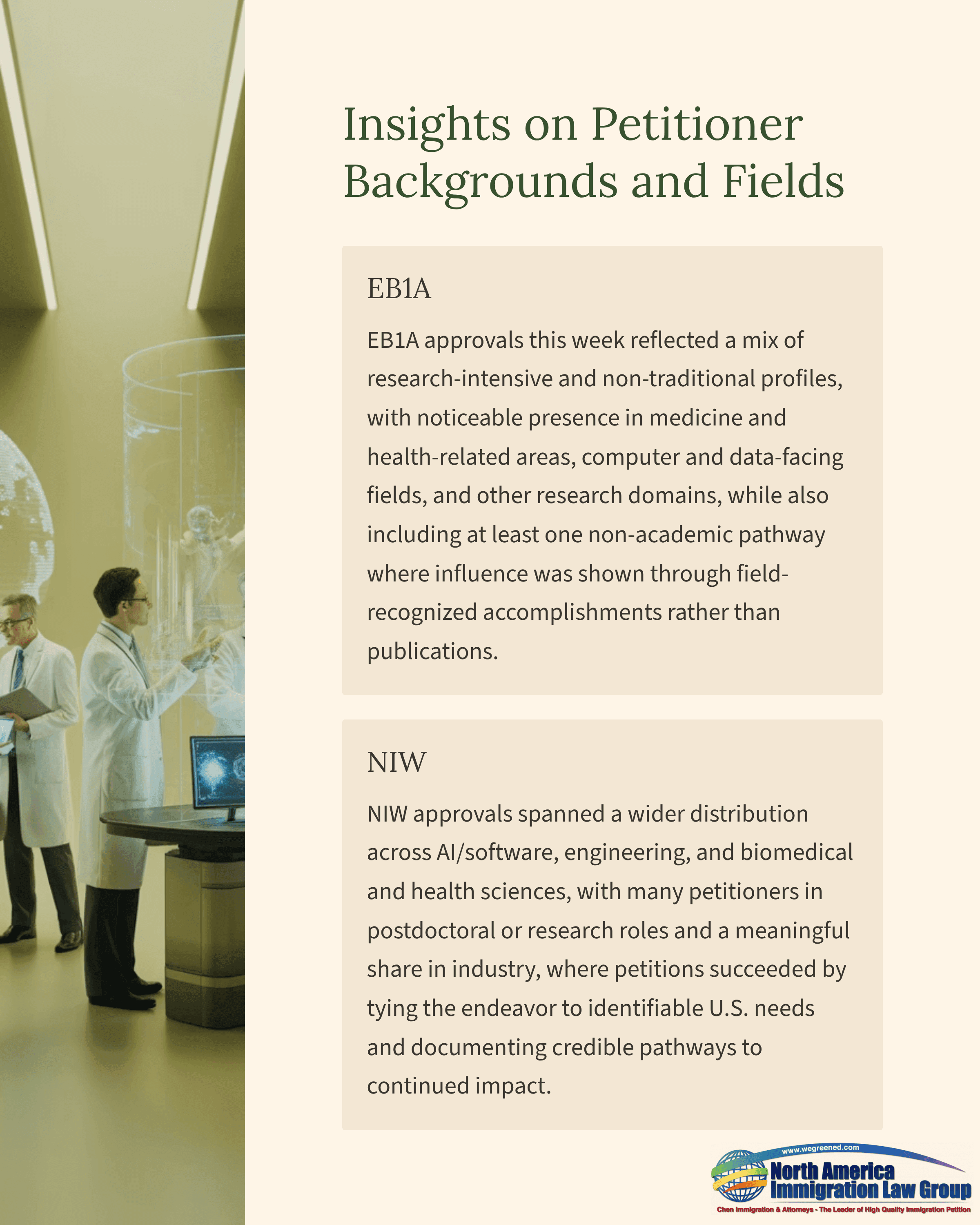 EB1A approvals this week reflected a mix of research-intensive and non-traditional profiles, with noticeable presence in medicine and health-related areas, computer and data-facing fields, and other research domains, while also including at least one non-academic pathway where influence was shown through field-recognized accomplishments rather than publications.
