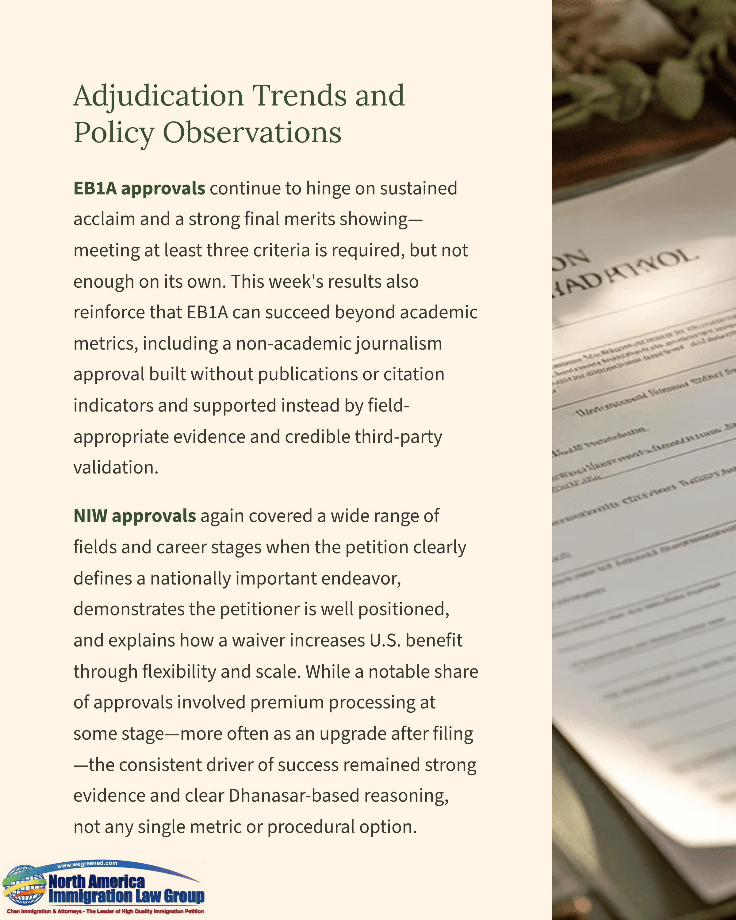 One notable EB1A approval this week involved a journalism professional pursuing a senior editorial strategy role at a major U.S. media organization. The petitioner holds a master’s degree, and the case was secured with a distinctly non-academic record that included no peer-reviewed publications and no citation record, demonstrating that extraordinary ability can be established through field-appropriate evidence of influence, recognition, and leadership. The case was filed with premium processing and approved in 120 days, and our team prepared four detailed expert recommendation letters to validate the petitioner’s standing and to translate field influence into the EB1A legal framework.