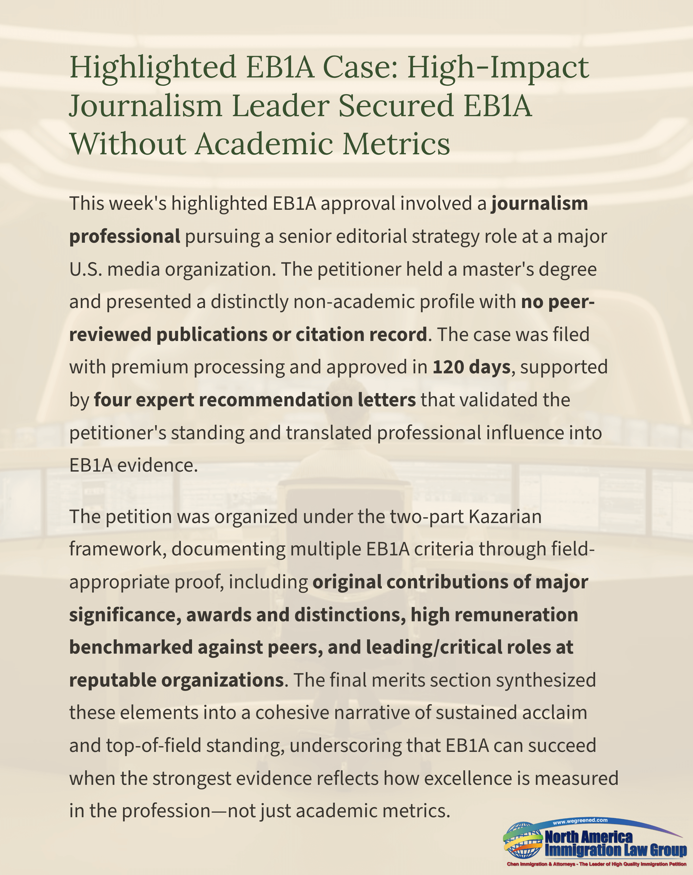 Highlighted EB1A Case: High-Impact Journalism Leader Secured EB1A Without Academic Metrics