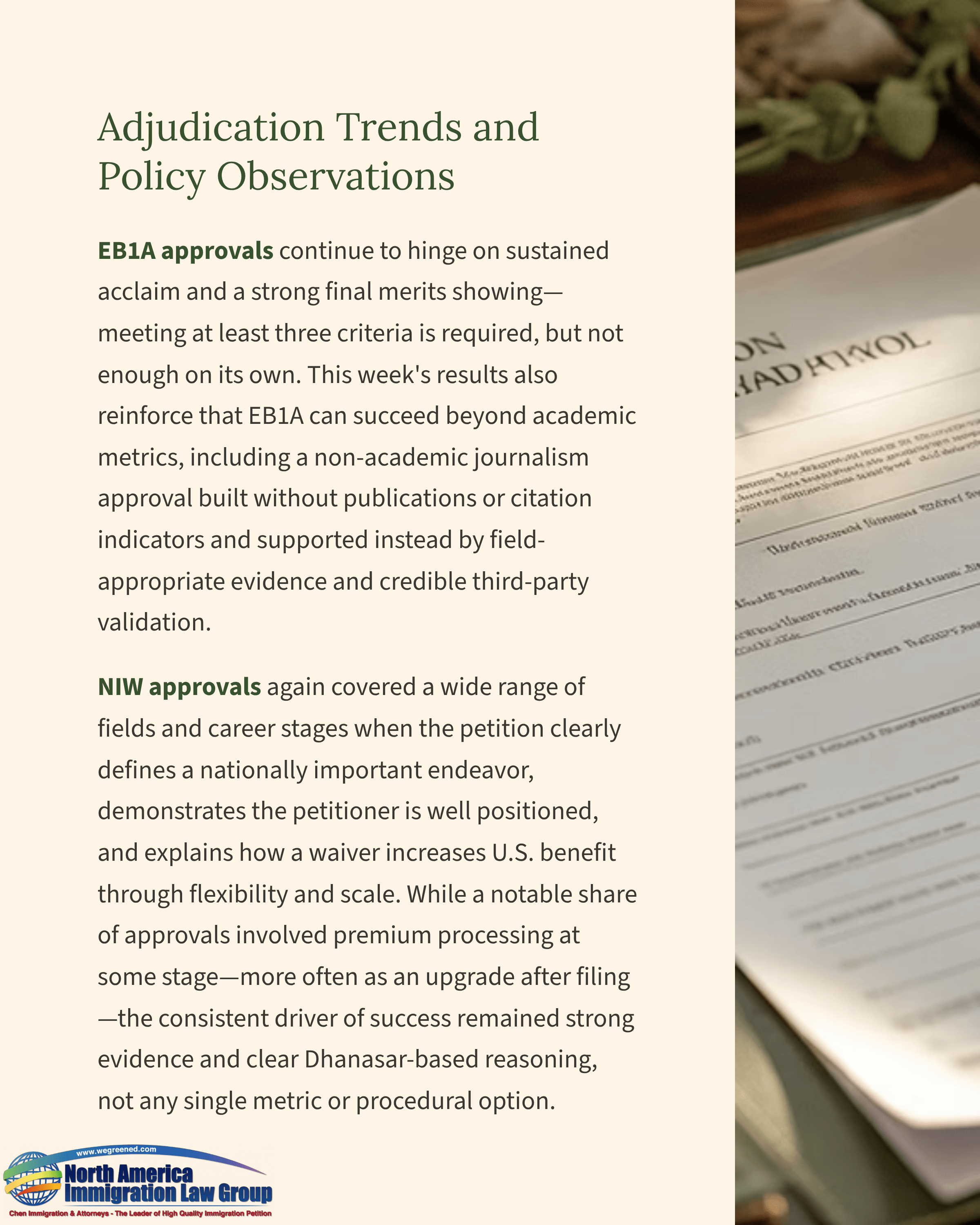 One notable EB1A approval this week involved a journalism professional pursuing a senior editorial strategy role at a major U.S. media organization. The petitioner holds a master’s degree, and the case was secured with a distinctly non-academic record that included no peer-reviewed publications and no citation record, demonstrating that extraordinary ability can be established through field-appropriate evidence of influence, recognition, and leadership. The case was filed with premium processing and approved in 120 days, and our team prepared four detailed expert recommendation letters to validate the petitioner’s standing and to translate field influence into the EB1A legal framework.