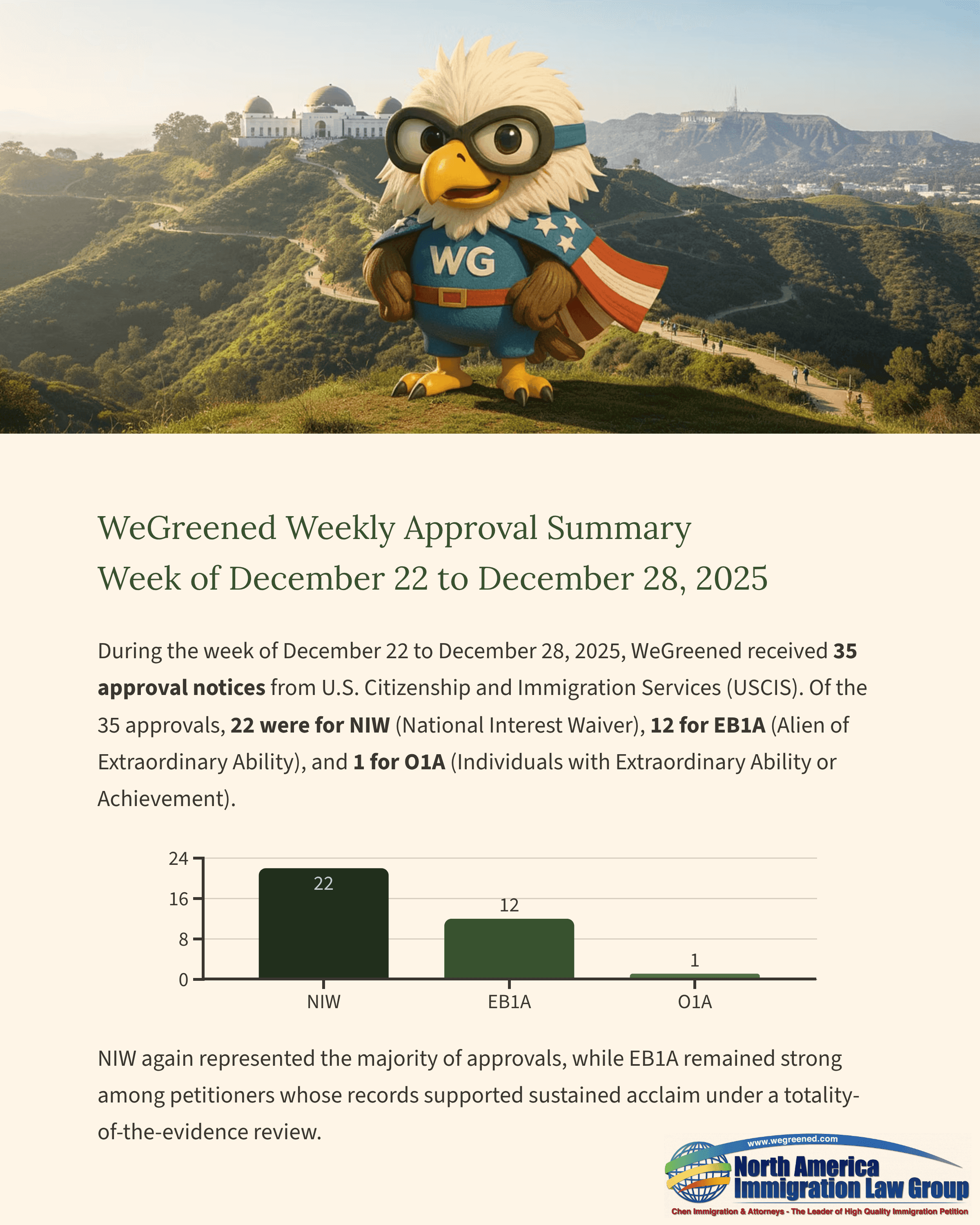 During the week of December 22 to December 28, 2025, WeGreened received 35 approval notices from U.S. Citizenship and Immigration Services (USCIS). Of the 35 approvals, 22 were for NIW (National Interest Waiver), 12 for EB1A (Alien of Extraordinary Ability), and 1 for O1A (Individuals with Extraordinary Ability or Achievement).