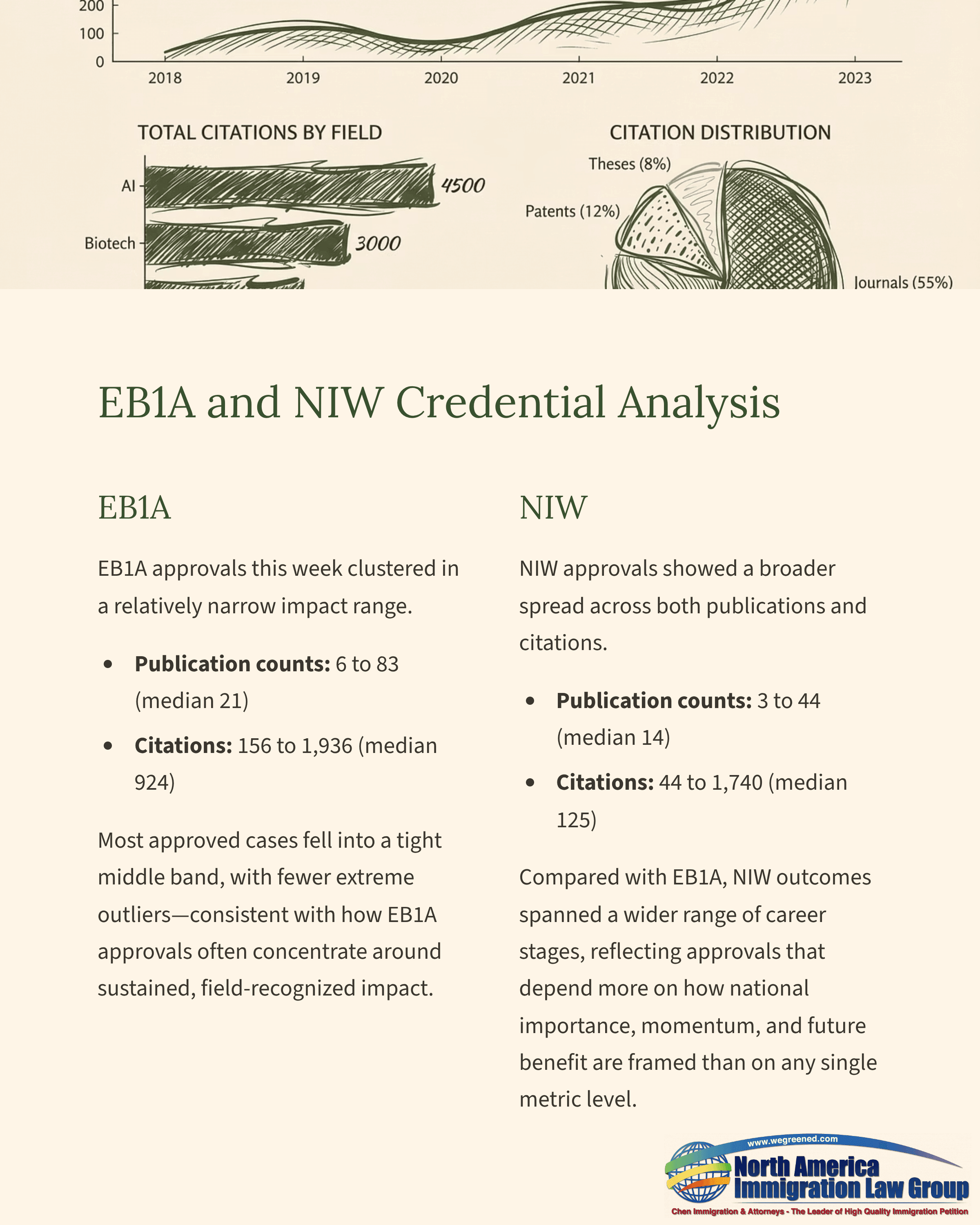 EB1A petitioners this week showed concentrated impact metrics. Publications ranged from 6 to 83 (Q1: 13.8, median: 21, Q3: 43), and citations ranged from 156 to 1,936 (Q1: 341.8, median: 924.5, Q3: 1,461.5). The distribution reflects a relatively tight middle band with a smaller number of higher-end profiles, which is consistent with how EB1A cases often present a more “compressed” metric range among approved cases.NIW petitioners reflected a broader spectrum of credential profiles. Publications ranged from 3 to 44 (Q1: 6.3, median: 14, Q3: 19.8), and citations ranged from 44 to 1,740 (Q1: 68, median: 125, Q3: 265). Compared with EB1A, NIW shows a wider spread on both publications and citations, indicating that approvals can include both earlier-stage records and more established scholarly profiles, depending on how the petition frames national importance, forward momentum, and future U.S. benefit.