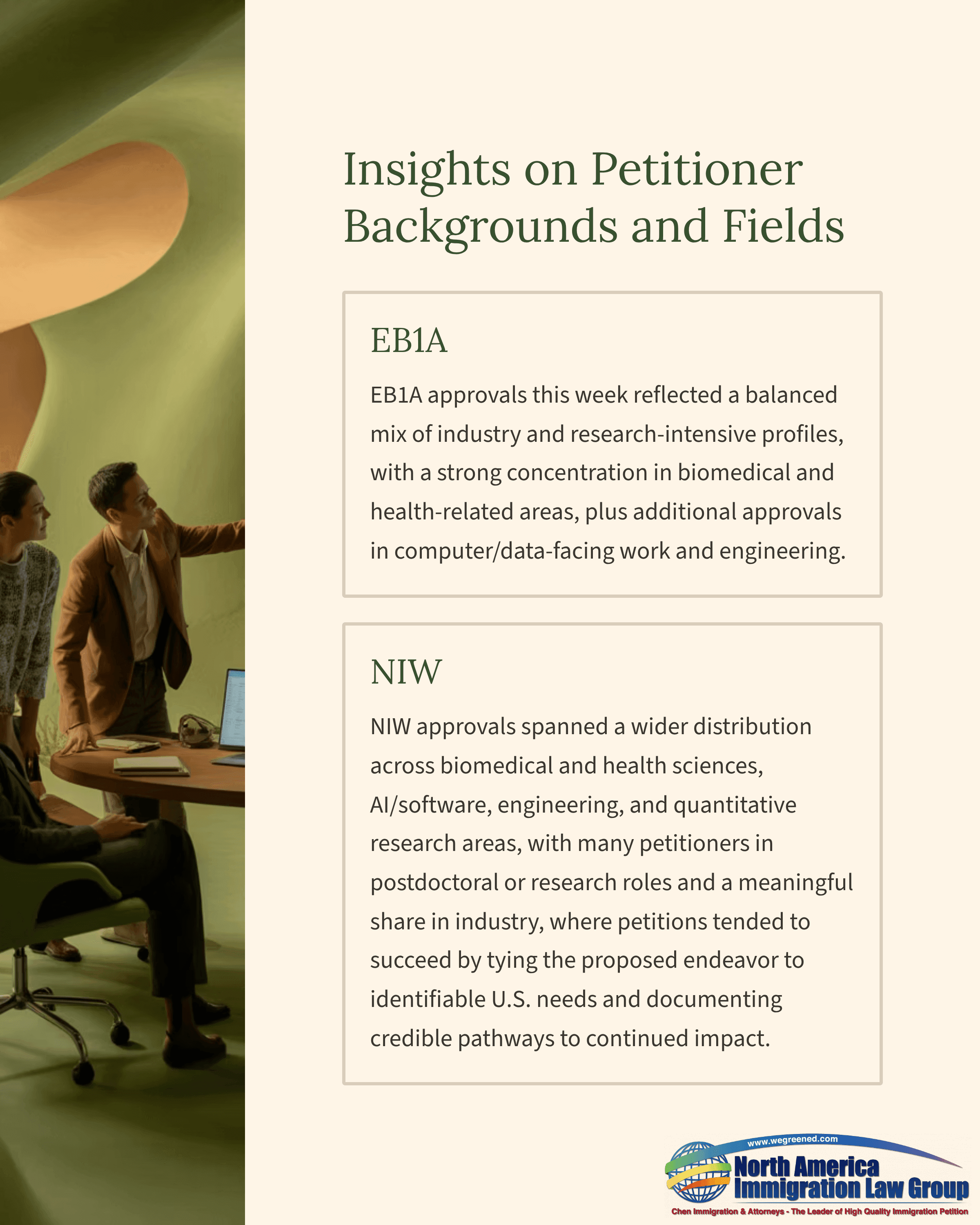 EB1A approvals this week reflected a balanced mix of industry and research-intensive profiles, with a strong concentration in biomedical and health-related areas, plus additional approvals in computer/data-facing work and engineering.NIW approvals spanned a wider distribution across biomedical and health sciences, AI/software, engineering, and quantitative research areas, with many petitioners in postdoctoral or research roles and a meaningful share in industry, where petitions tended to succeed by tying the proposed endeavor to identifiable U.S. needs and documenting credible pathways to continued impact.