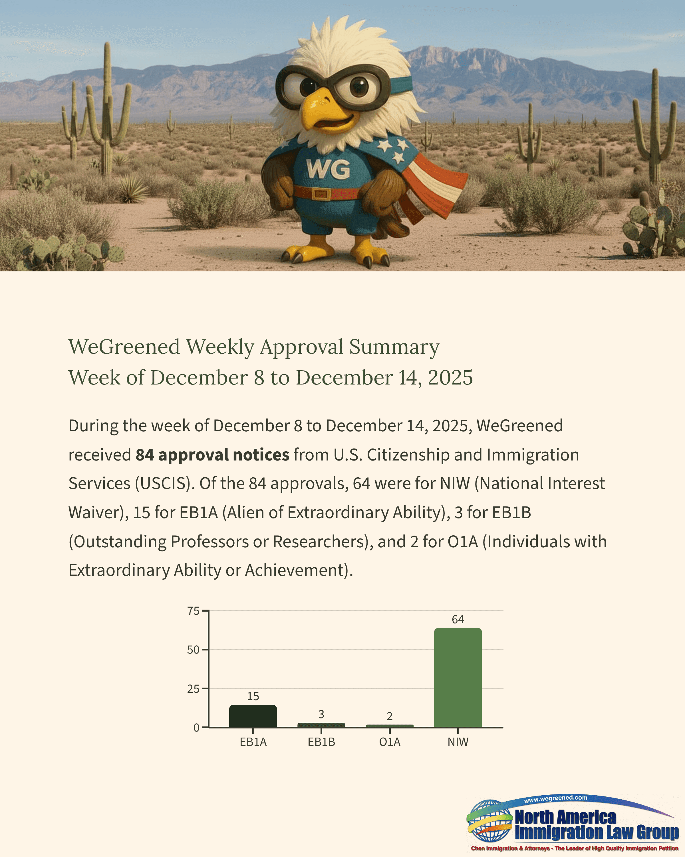 During the week of December 8 to December 14, 2025, WeGreened received 84 approval notices from U.S. Citizenship and Immigration Services (USCIS). Of the 84 approvals, 64 were for NIW (National Interest Waiver), 15 for EB1A (Alien of Extraordinary Ability), 3 for EB1B (Outstanding Professors or Researchers), and 2 for O1A (Individuals with Extraordinary Ability or Achievement).