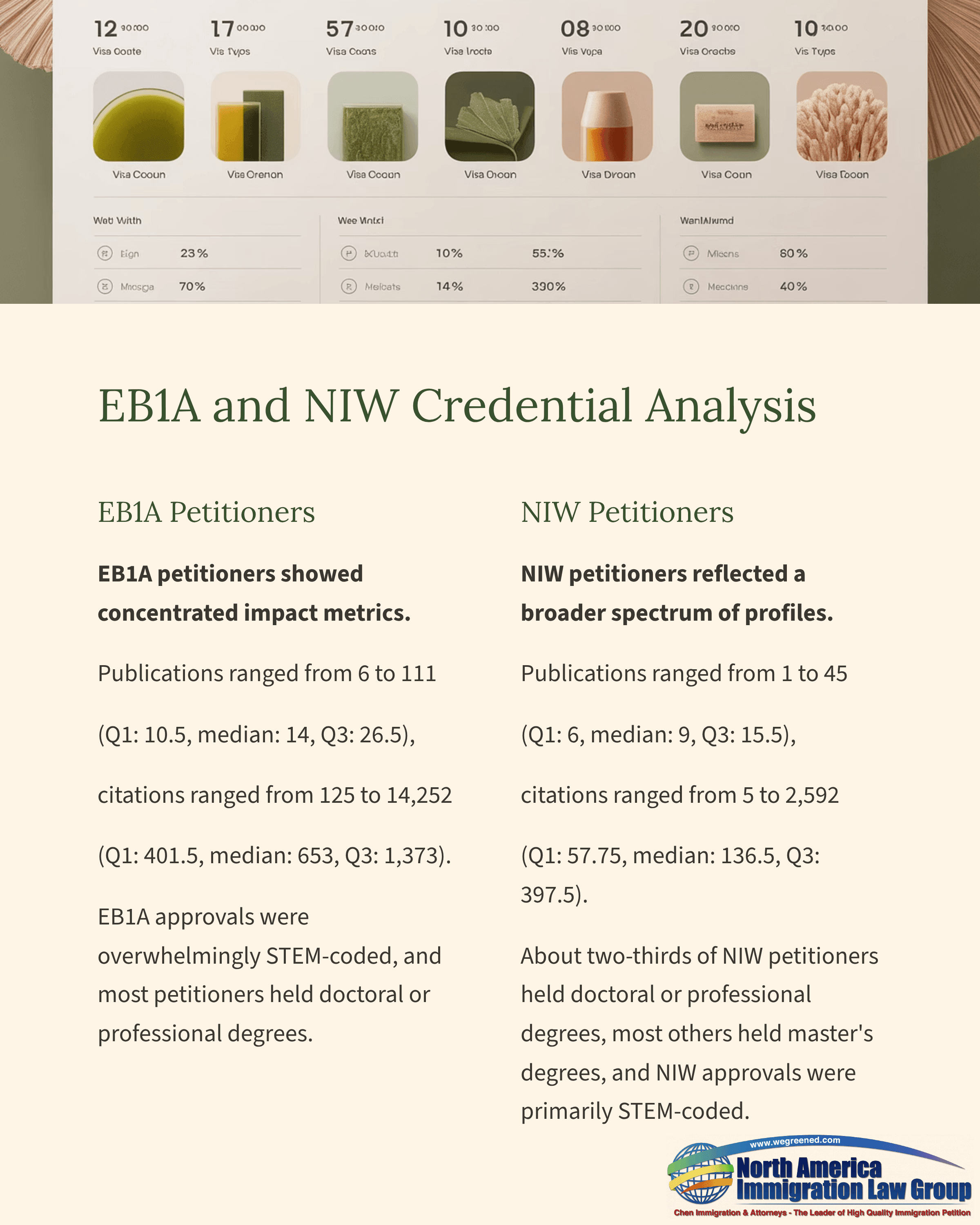 NIW petitioners reflected a broader spectrum of profiles. Publications ranged from 1 to 45 (Q1: 6, median: 9, Q3: 15.5), and citations ranged from 5 to 2,592 (Q1: 57.75, median: 136.5, Q3: 397.5). About two-thirds of NIW petitioners held doctoral or professional degrees, most others held master’s degrees, and NIW approvals were primarily STEM-coded.