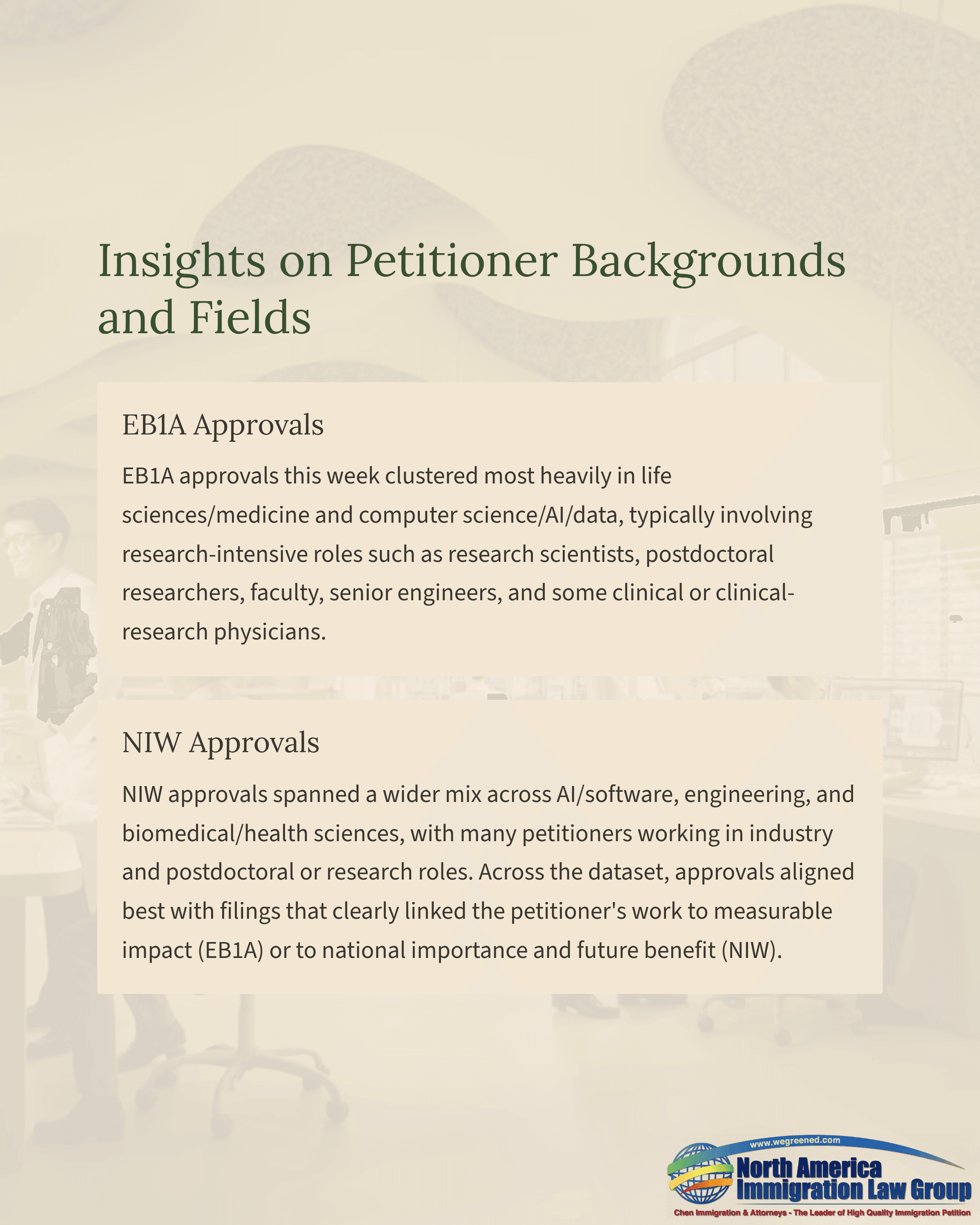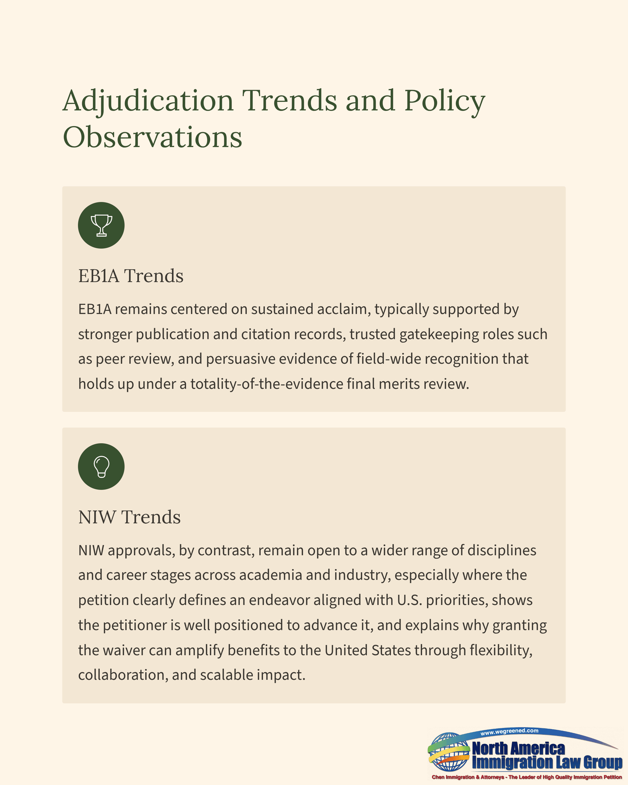 NIW approvals, by contrast, remain open to a wider range of disciplines and career stages across academia and industry, especially where the petition clearly defines an endeavor aligned with U.S. priorities, shows the petitioner is well positioned to advance it, and explains why granting the waiver can amplify benefits to the United States through flexibility, collaboration, and scalable impact.