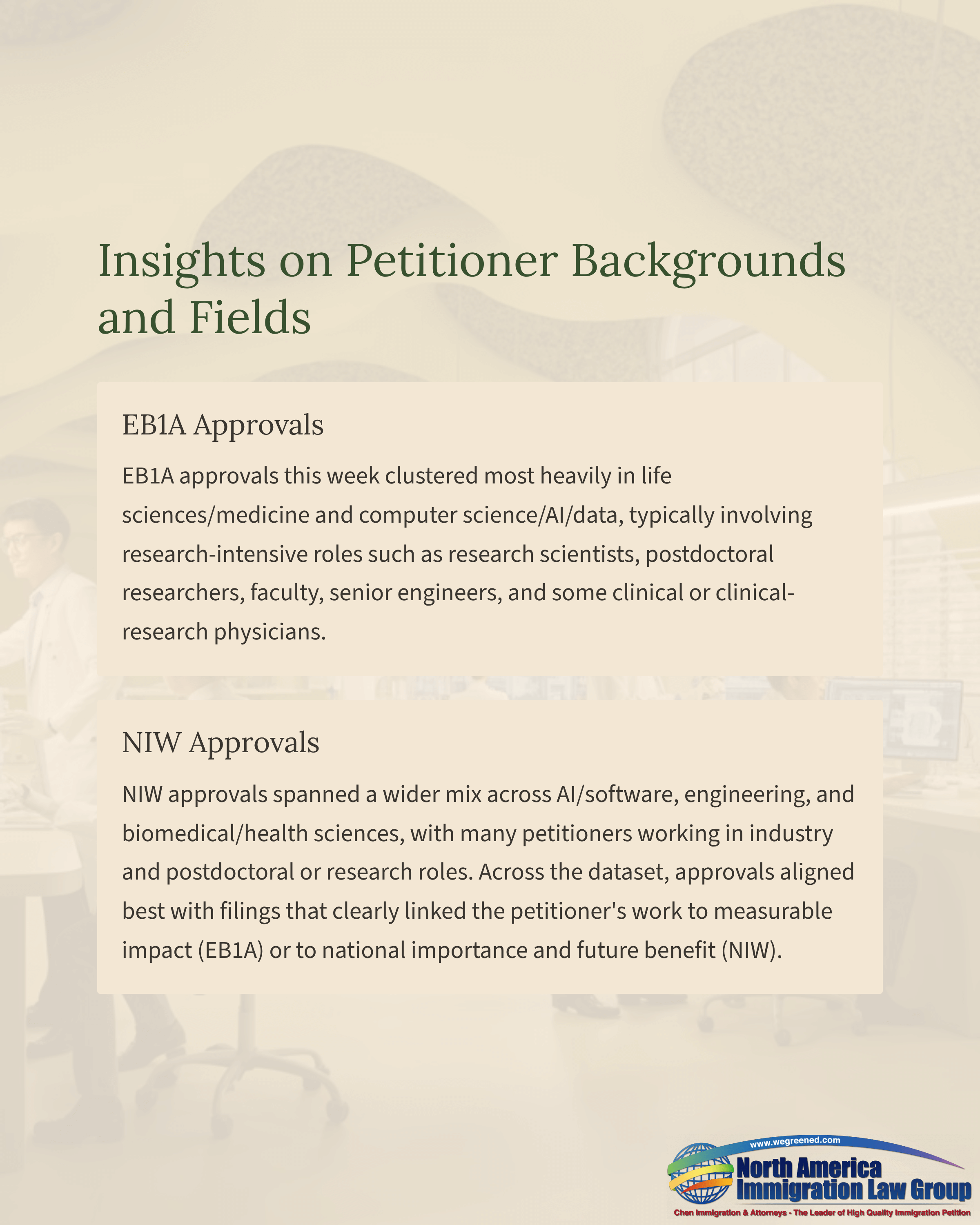 The EB-2 NIW category again represented the majority of approvals, while EB-1A remained strong among highly accomplished researchers, clinicians, and industry professionals.