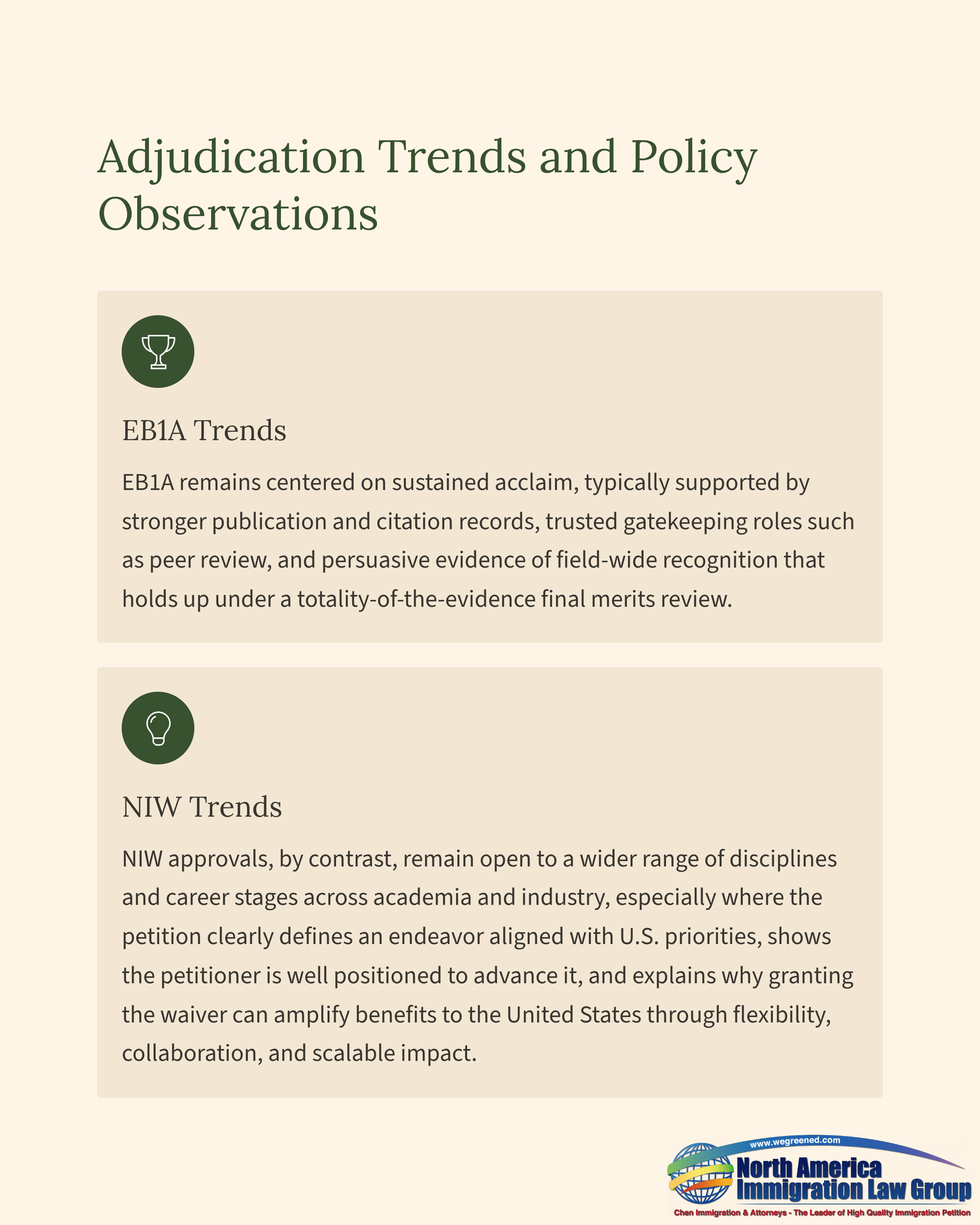 NIW approvals, by contrast, remain open to a wider range of disciplines and career stages across academia and industry, especially where the petition clearly defines an endeavor aligned with U.S. priorities, shows the petitioner is well positioned to advance it, and explains why granting the waiver can amplify benefits to the United States through flexibility, collaboration, and scalable impact.