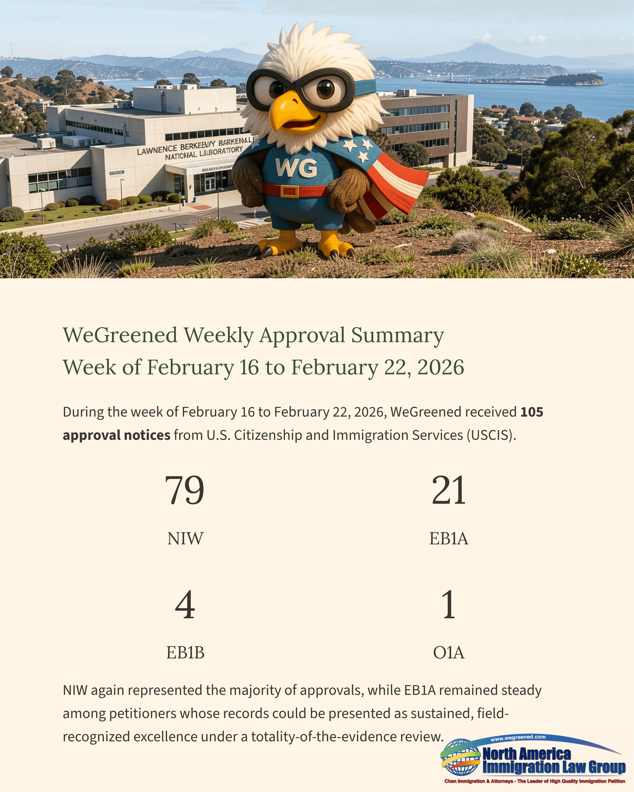 During the week of February 16 to February 22, 2026, WeGreened received 105 approval notices from U.S. Citizenship and Immigration Services (USCIS). Of the 105 approvals, 79 were for NIW (National Interest Waiver), 21 for EB1A (Alien of Extraordinary Ability), 4 for EB1B (Outstanding Professors or Researchers), and 1 for O1A (Individuals with Extraordinary Ability or Achievement).