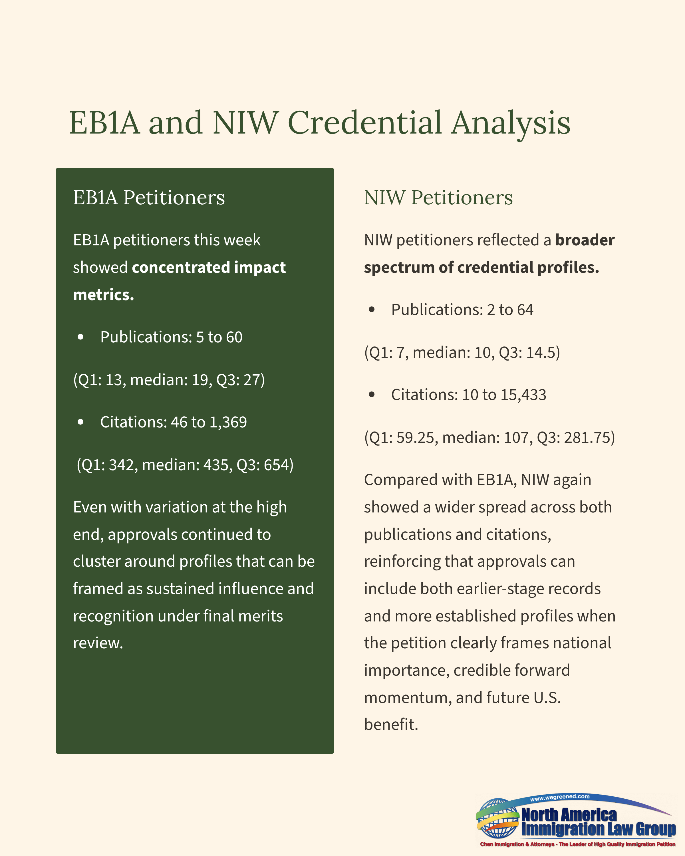 NIW petitioners reflected a broader spectrum of credential profiles. Publications ranged from 2 to 64 (Q1: 7, median: 10, Q3: 14.5), and citations ranged from 10 to 15,433 (Q1: 59.25, median: 107, Q3: 281.75). Compared with EB1A, NIW again showed a wider spread across both publications and citations, reinforcing that approvals can include both earlier-stage records and more established profiles when the petition clearly frames national importance, credible forward momentum, and future U.S. benefit.