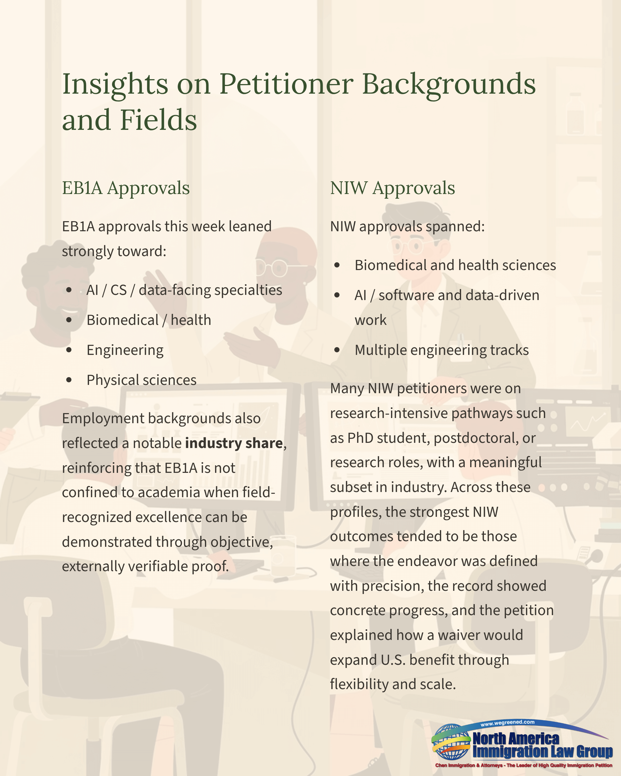 NIW approvals spanned biomedical and health sciences, AI/software and data-driven work, and multiple engineering tracks. Many NIW petitioners were on research-intensive pathways such as PhD student, postdoctoral, or research roles, with a meaningful subset in industry. Across these profiles, the strongest NIW outcomes tended to be those where the endeavor was defined with precision, the record showed concrete progress, and the petition explained how a waiver would expand U.S. benefit through flexibility and scale.