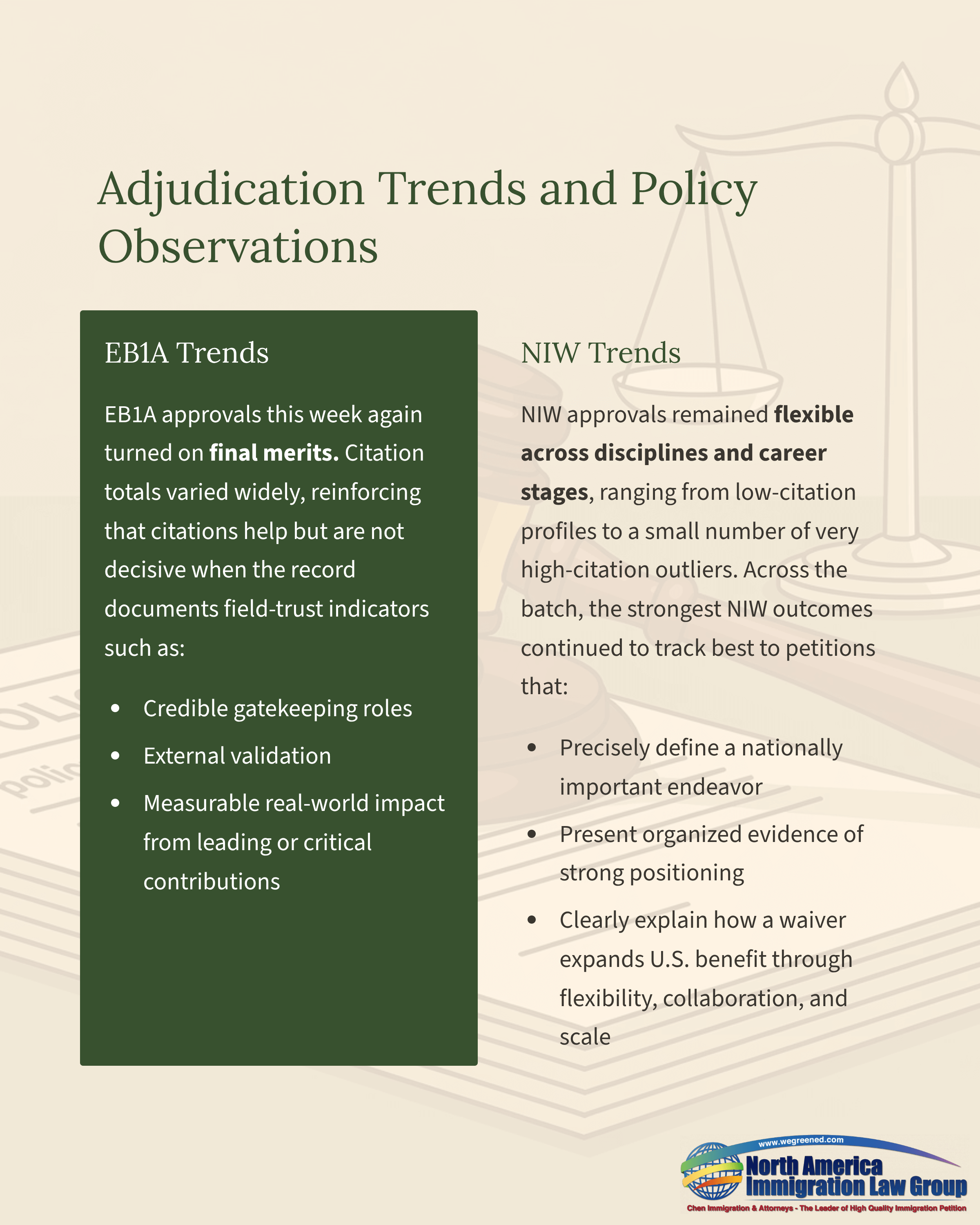 NIW approvals continued to reflect broad flexibility across disciplines and career stages, spanning from the low end of citations through one extreme high-citation outlier at the top end. Across the batch, the consistent throughline remained unchanged: the strongest NIW outcomes tracked best to petitions that precisely define a nationally important endeavor, present organized and concrete evidence showing the petitioner is well positioned, and clearly explain how a waiver expands U.S. benefit through flexibility, collaboration, and scale.