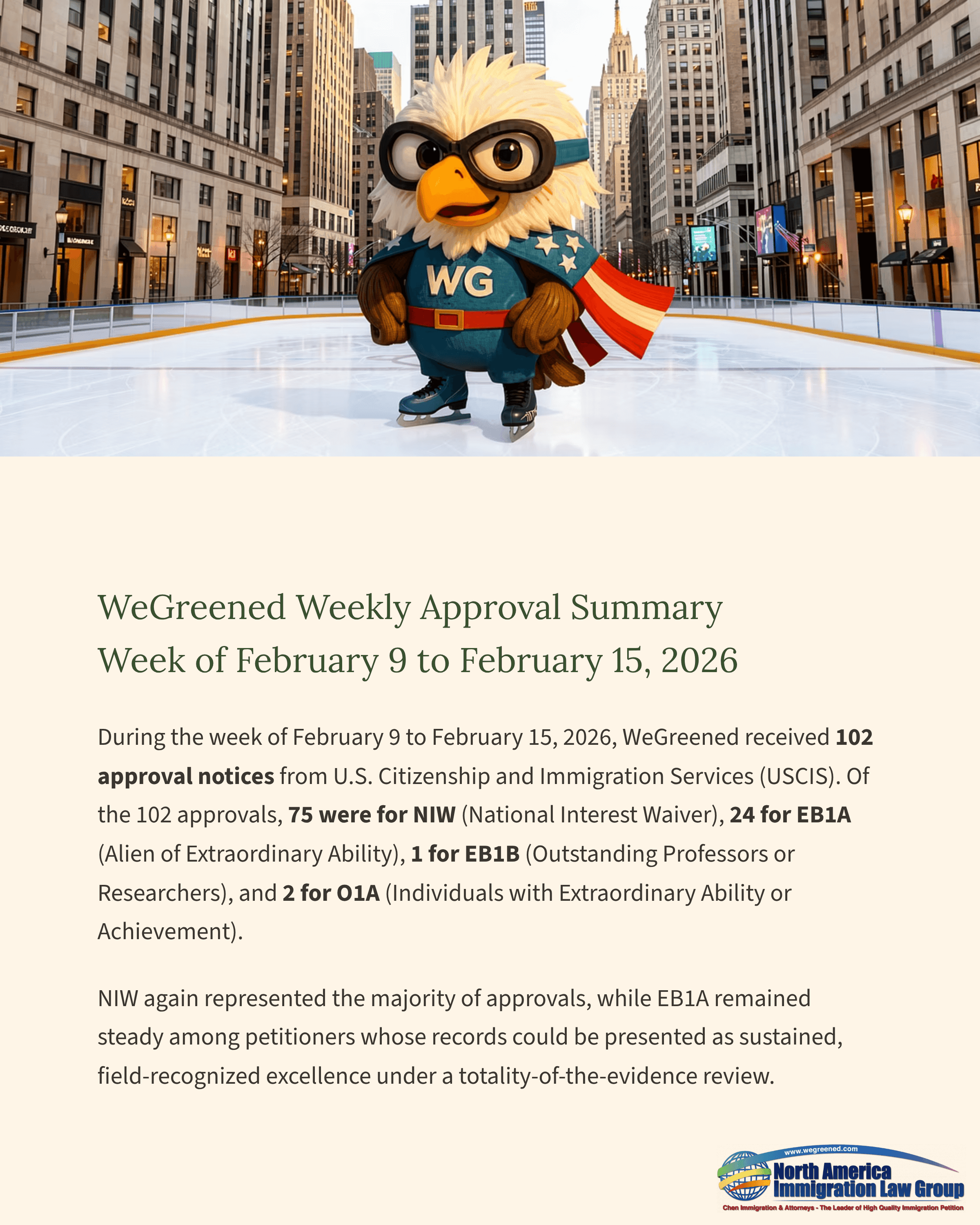 During the week of February 9 to February 15, 2026, WeGreened received 102 approval notices from U.S. Citizenship and Immigration Services (USCIS). Of the 102 approvals, 75 were for NIW (National Interest Waiver), 24 for EB1A (Alien of Extraordinary Ability), 1 for EB1B (Outstanding Professors or Researchers), and 2 for O1A (Individuals with Extraordinary Ability or Achievement).