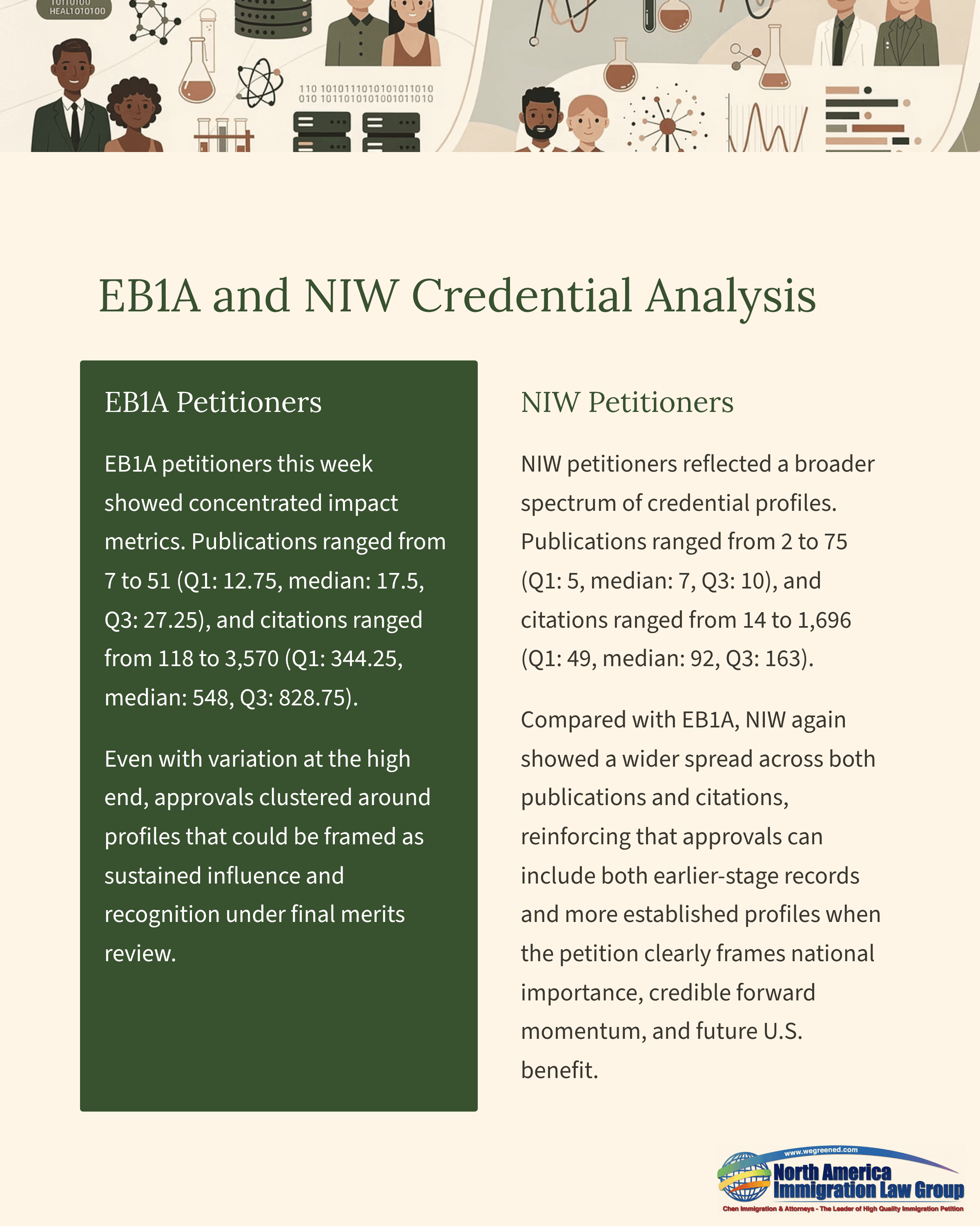 NIW petitioners reflected a broader spectrum of credential profiles. Publications ranged from 2 to 75 (Q1: 5, median: 7, Q3: 10), and citations ranged from 14 to 1,696 (Q1: 49, median: 92, Q3: 163). Compared with EB1A, NIW again showed a wider spread across both publications and citations, reinforcing that approvals can include both earlier-stage records and more established profiles when the petition clearly frames national importance, credible forward momentum, and future U.S. benefit.