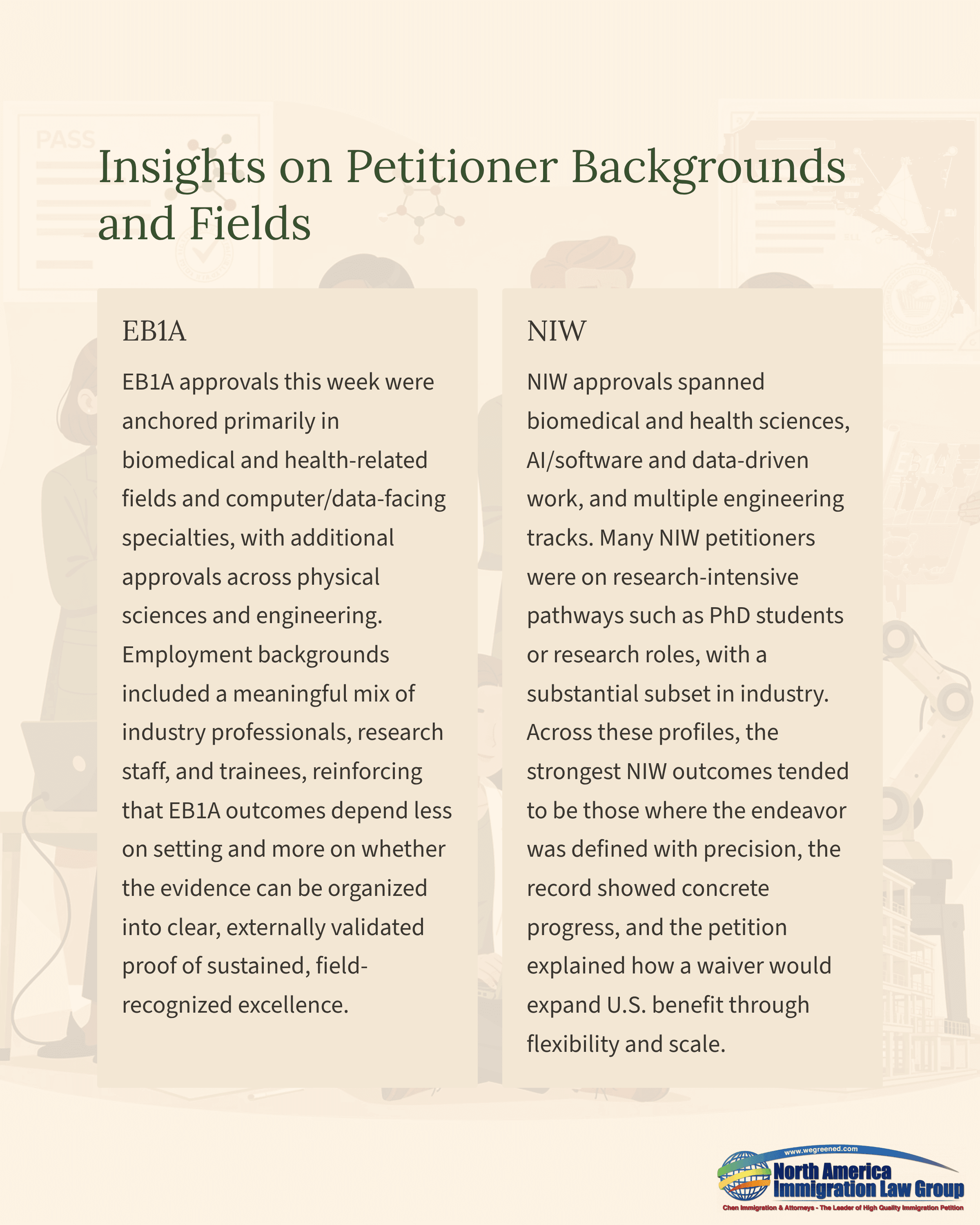 NIW approvals spanned biomedical and health sciences, AI/software and data-driven work, and multiple engineering tracks. Many NIW petitioners were on research-intensive pathways such as PhD students or research roles, with a substantial subset in industry. Across these profiles, the strongest NIW outcomes tended to be those where the endeavor was defined with precision, the record showed concrete progress, and the petition explained how a waiver would expand U.S. benefit through flexibility and scale.