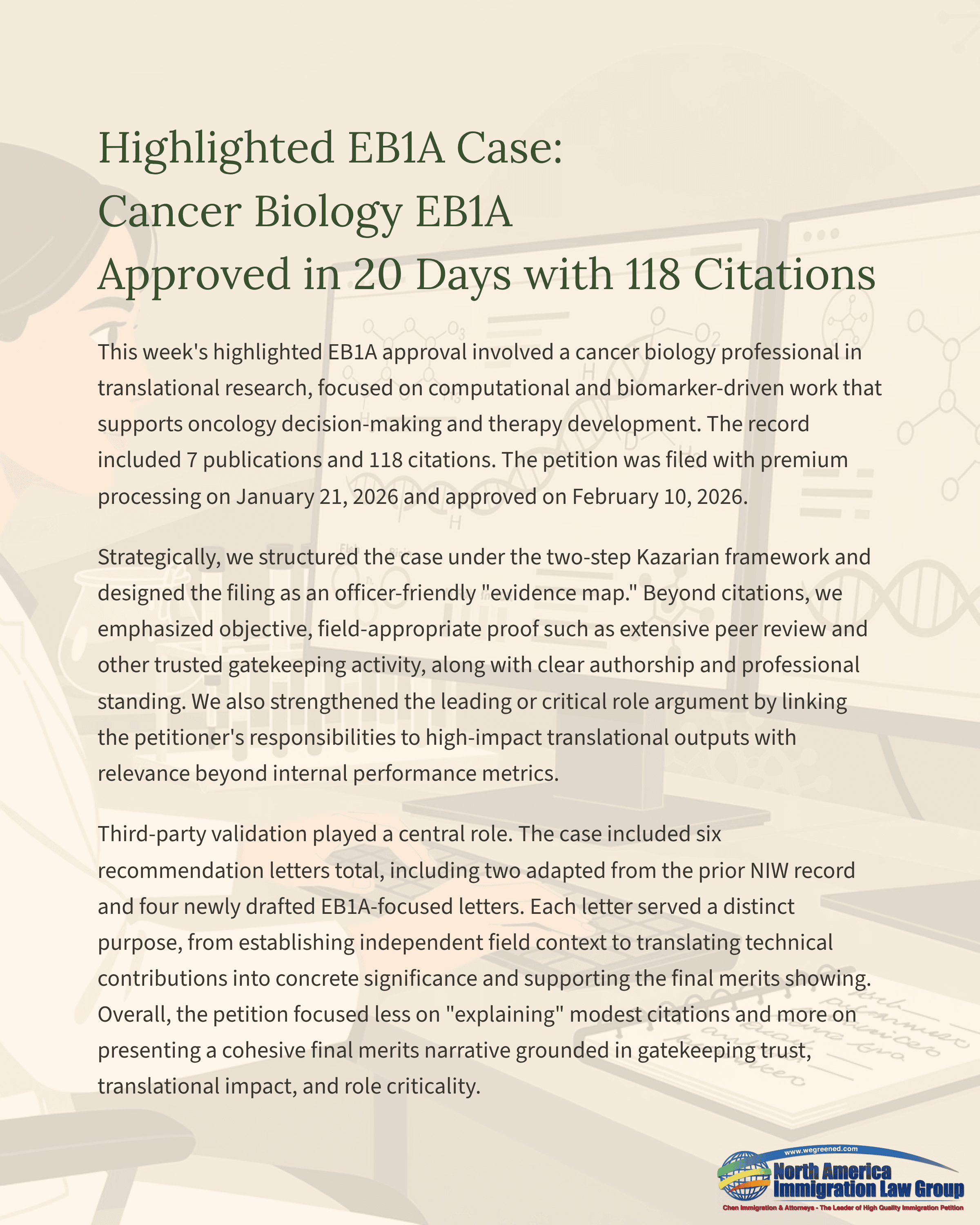 Highlighted EB1A Case: Cancer Biology EB1A Approved in 20 Days with 118 Citations