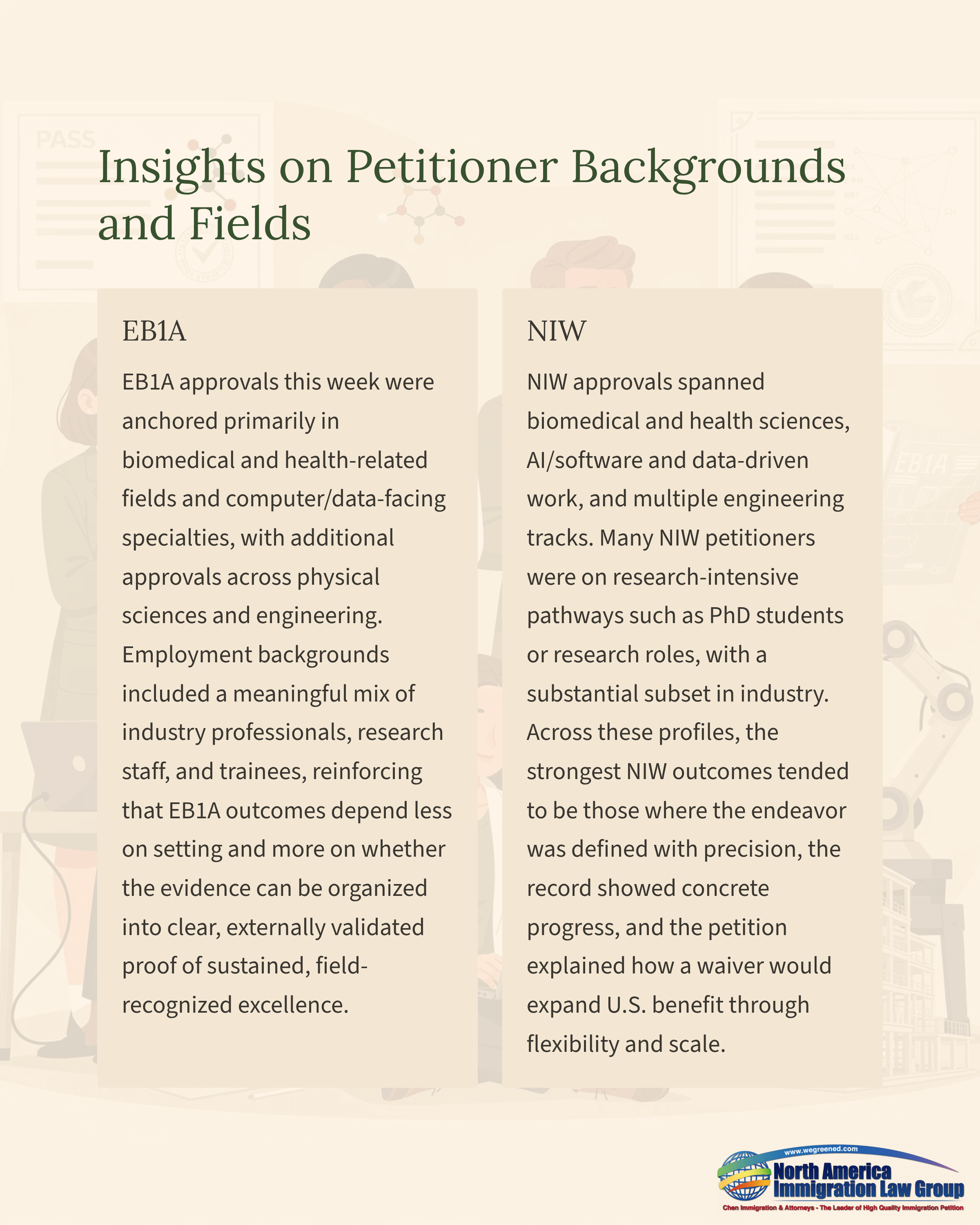 NIW approvals spanned biomedical and health sciences, AI/software and data-driven work, and multiple engineering tracks. Many NIW petitioners were on research-intensive pathways such as PhD students or research roles, with a substantial subset in industry. Across these profiles, the strongest NIW outcomes tended to be those where the endeavor was defined with precision, the record showed concrete progress, and the petition explained how a waiver would expand U.S. benefit through flexibility and scale.