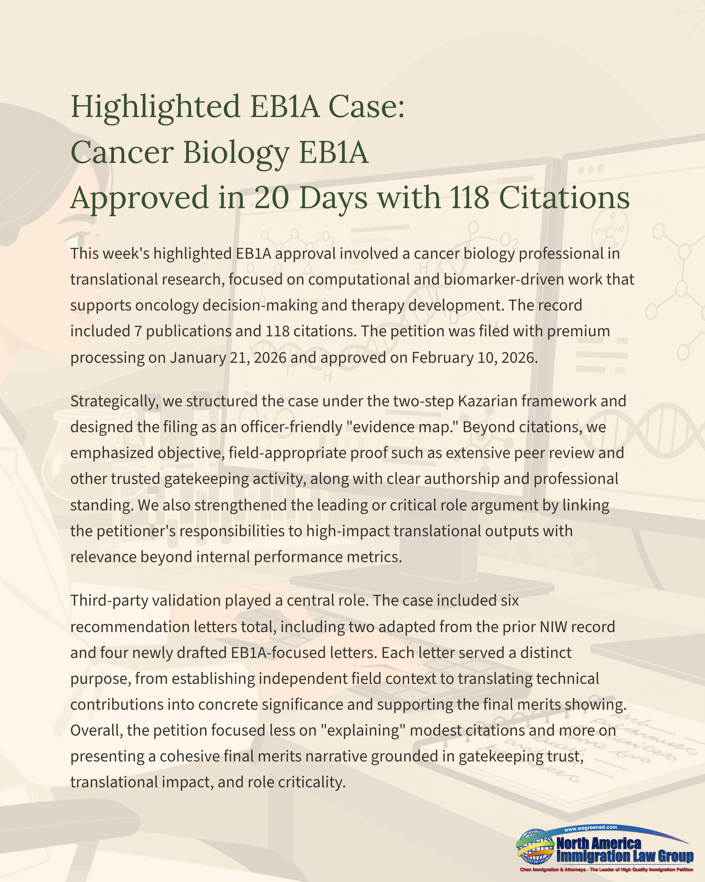 Highlighted EB1A Case: Cancer Biology EB1A Approved in 20 Days with 118 Citations