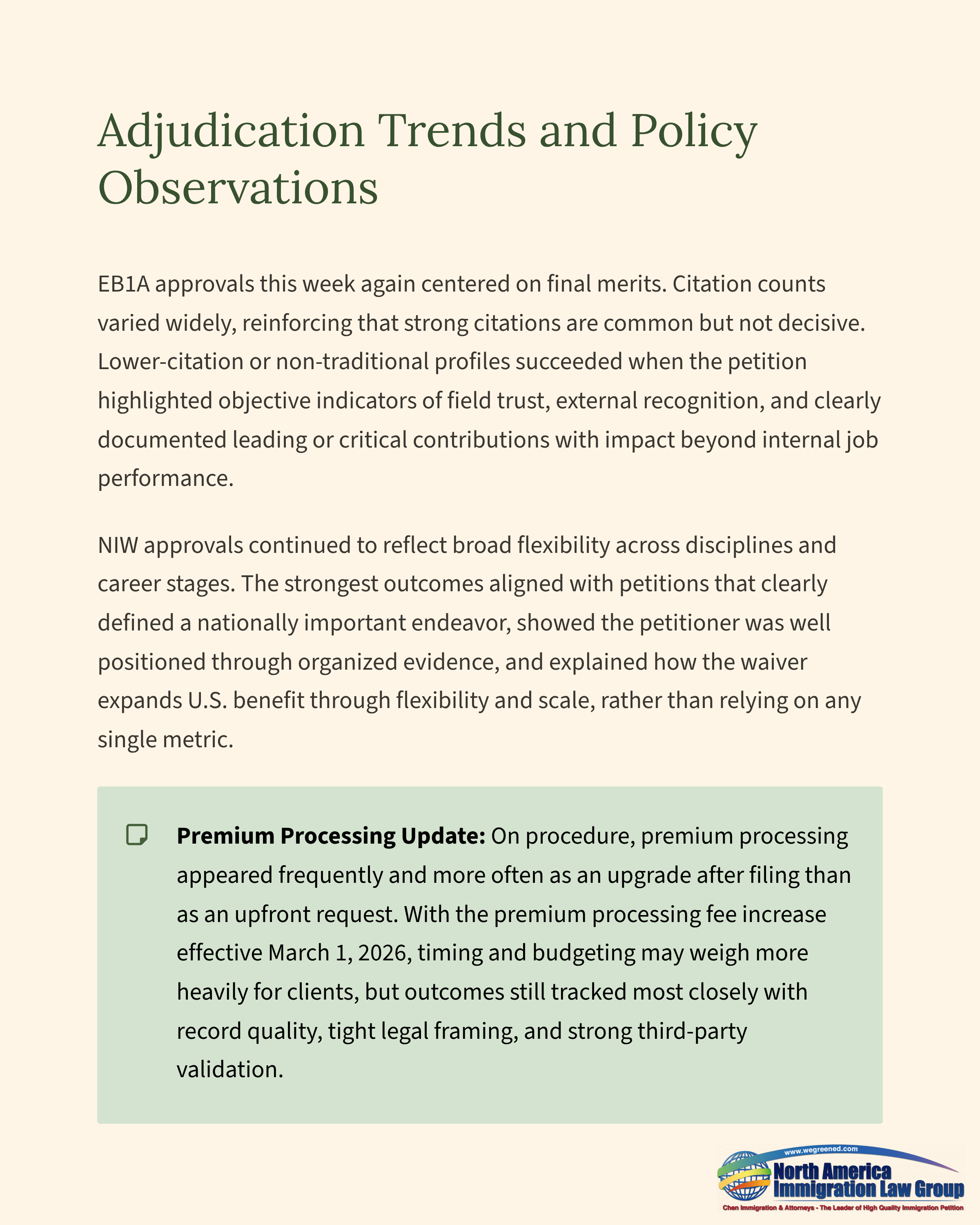 Procedurally, premium processing featured prominently again, more often as an upgrade after initial standard filing than as an upfront request. With the premium processing fee increase taking effect on March 1, 2026, timing and budgeting may weigh more heavily in client decision-making. Across this batch, however, success aligned most closely with overall record quality, tight legal framing under the relevant framework, and effective third-party validation rather than procedural choices alone.