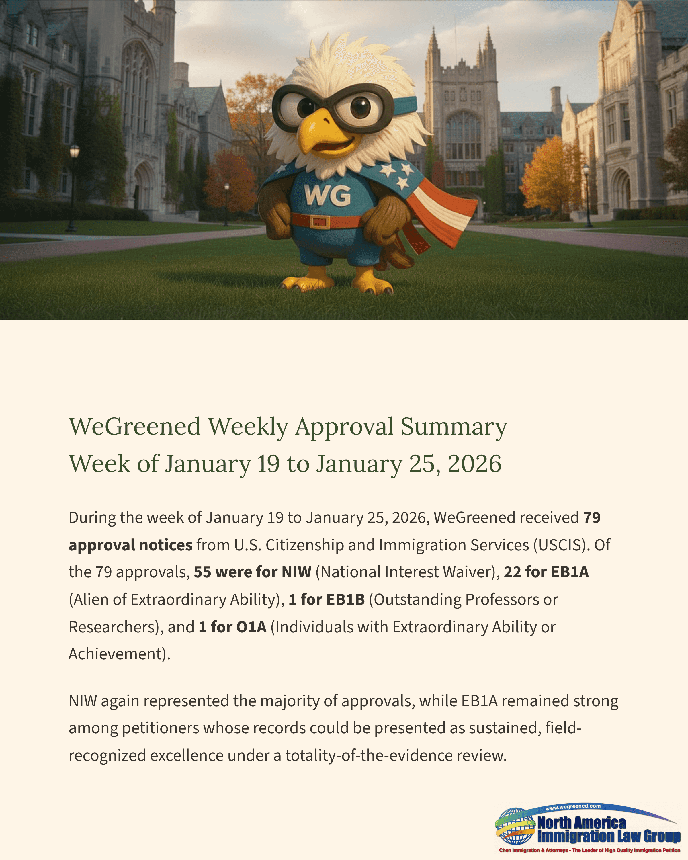 During the week of January 19 to January 25, 2026, WeGreened received 79 approval notices from U.S. Citizenship and Immigration Services (USCIS). Of the 79 approvals, 55 were for NIW (National Interest Waiver), 22 for EB1A (Alien of Extraordinary Ability), 1 for EB1B (Outstanding Professors or Researchers), and 1 for O1A (Individuals with Extraordinary Ability or Achievement). NIW again represented the majority of approvals, while EB1A remained strong among petitioners whose records could be presented as sustained, field-recognized excellence under a totality-of-the-evidence review.