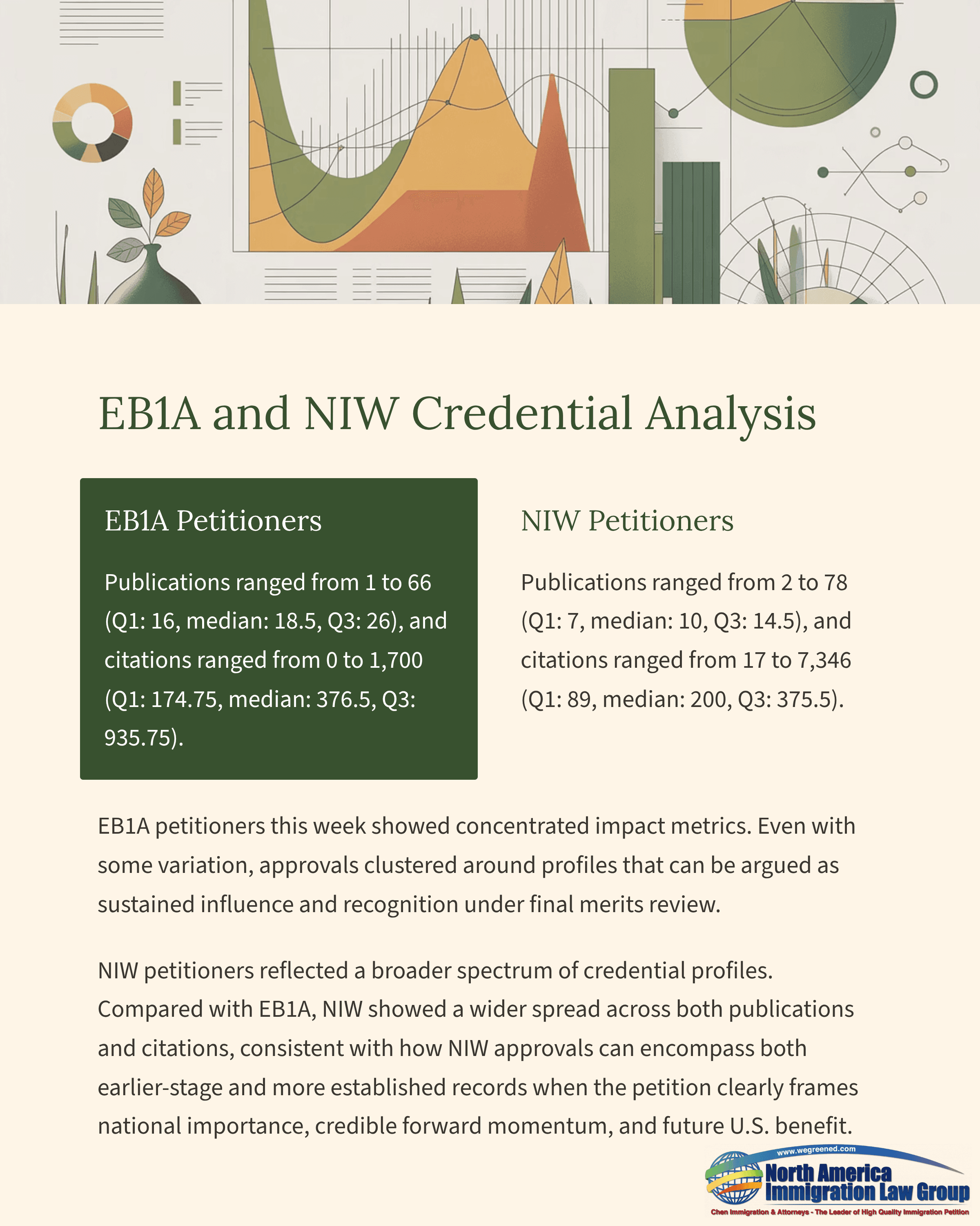 NIW petitioners reflected a broader spectrum of credential profiles. Publications ranged from 2 to 78 (Q1: 7, median: 10, Q3: 14.5), and citations ranged from 17 to 7,346 (Q1: 89, median: 200, Q3: 375.5). Compared with EB1A, NIW showed a wider spread across both publications and citations, consistent with how NIW approvals can encompass both earlier-stage and more established records when the petition clearly frames national importance, credible forward momentum, and future U.S. benefit.