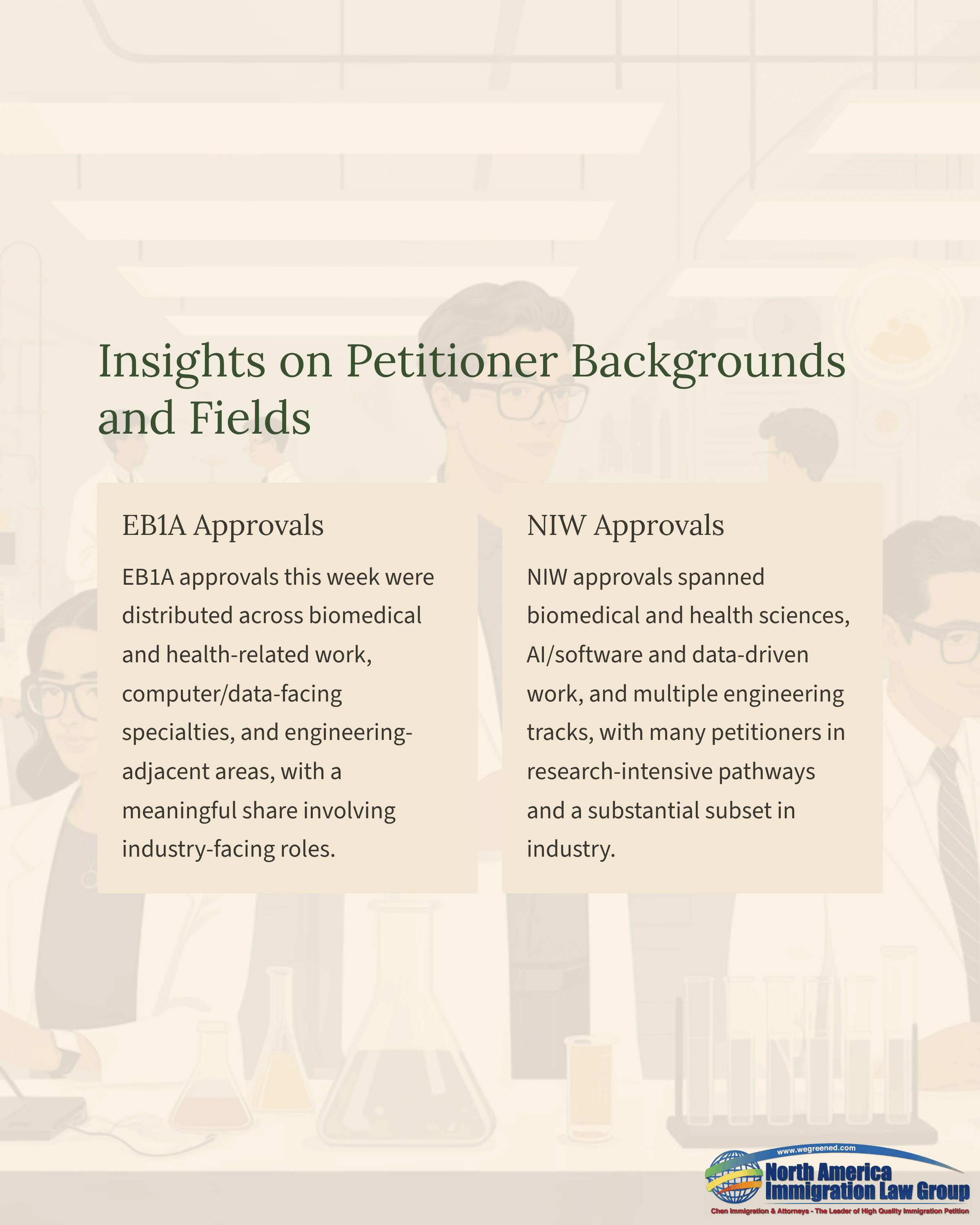 NIW approvals spanned biomedical and health sciences, AI/software and data-driven work, and multiple engineering tracks, with many petitioners in research-intensive pathways and a substantial subset in industry.