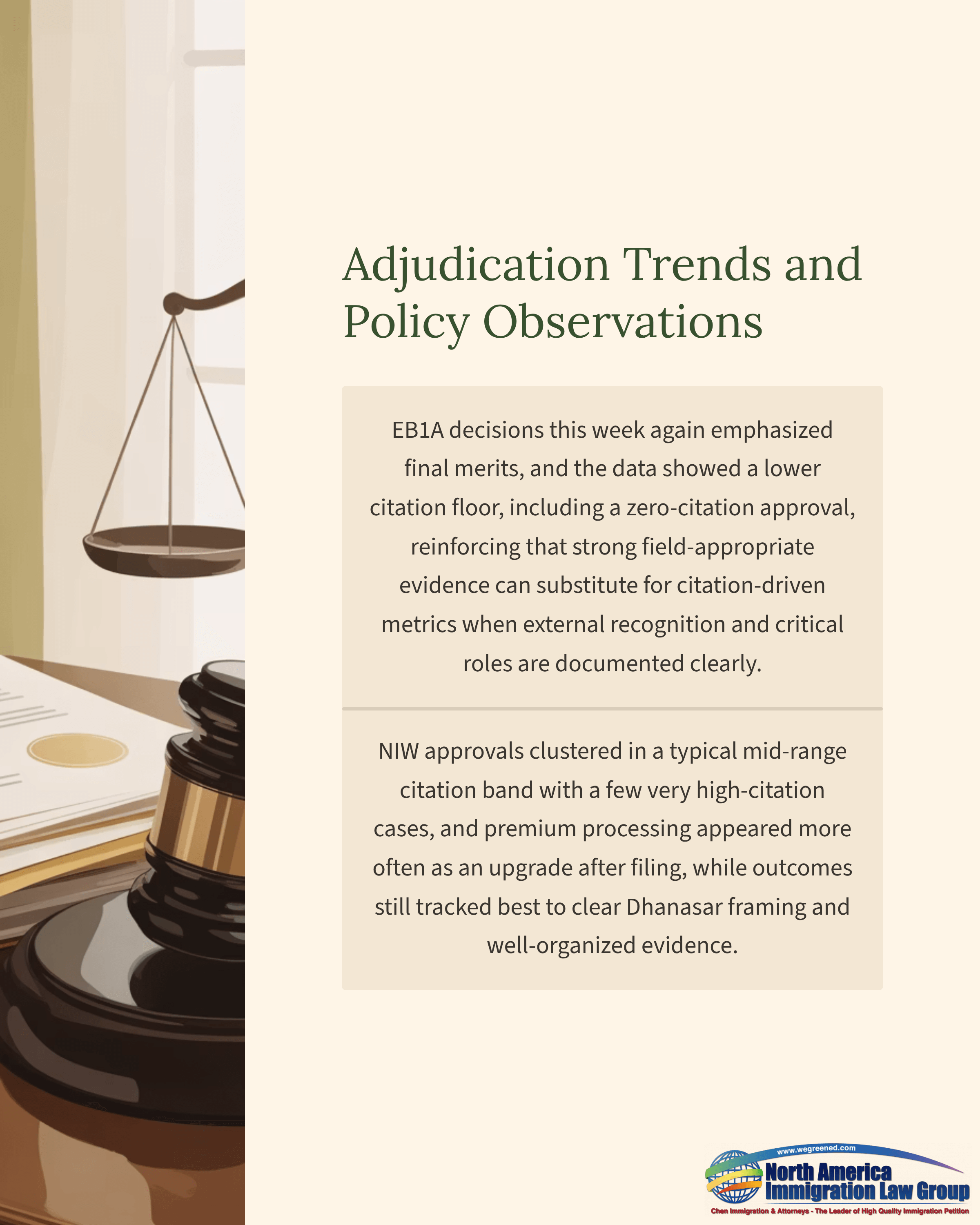 This week’s data again reflect that EB1A adjudication turns on final merits: meeting three criteria is the entry point, but approvals align best with records that clearly add up to sustained acclaim under the totality of the evidence. A notable takeaway in this batch is the presence of a zero-citation EB1A approval, reinforcing that officers can credit non-citation proof when external recognition, judging, leadership, and consequential contributions are documented cleanly and persuasively.