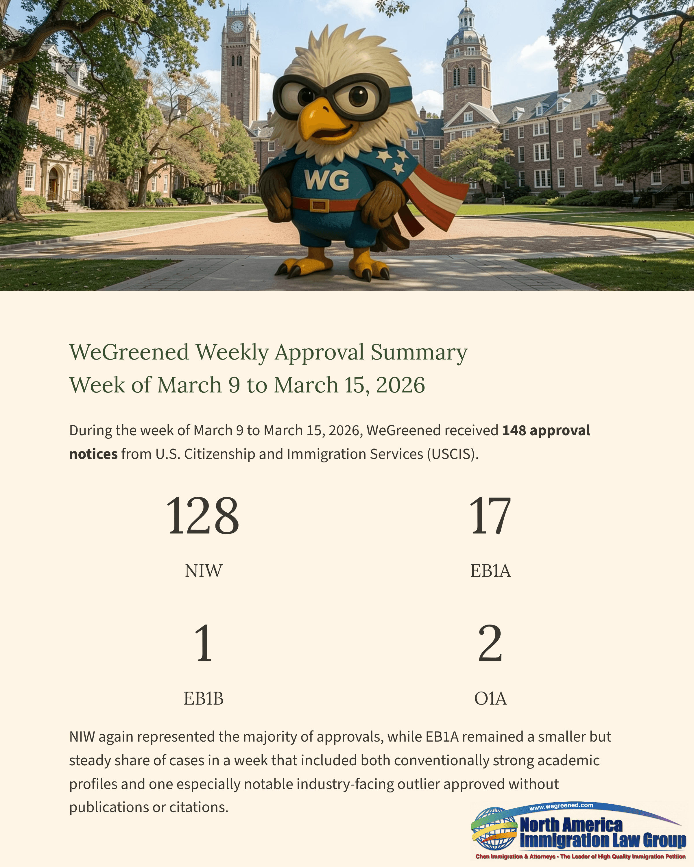 During the week of March 9 to March 15, 2026, WeGreened received 148 approval notices from U.S. Citizenship and Immigration Services (USCIS). Of the 148 approvals, 128 were for NIW (National Interest Waiver), 17 were for EB1A (Alien of Extraordinary Ability), 1 was for EB1B (Outstanding Professors or Researchers), and 2 were for O1A (Individuals with Extraordinary Ability or Achievement).