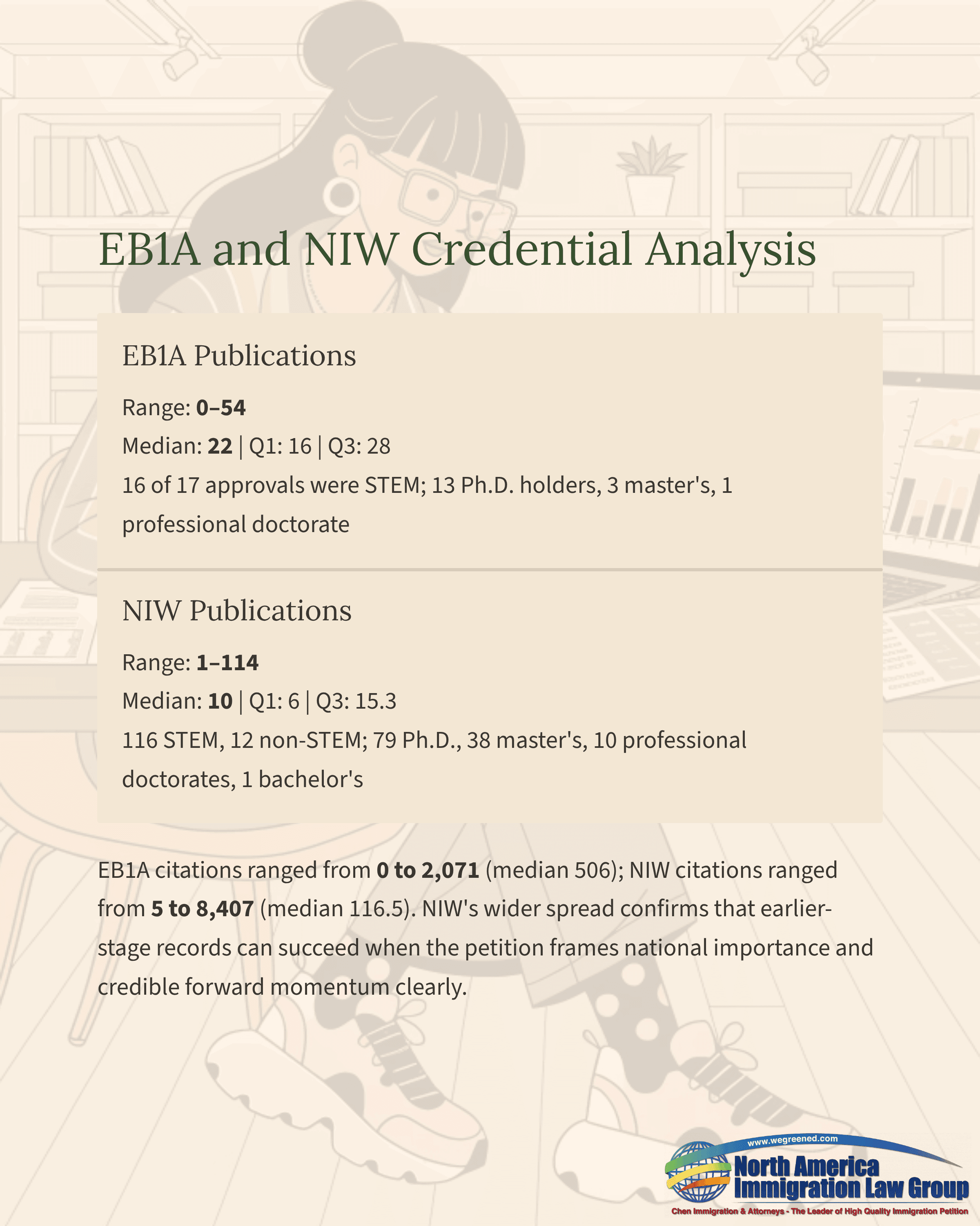 EB1A petitioners this week showed a wider spread at the low end than usual because the dataset included an approval with no publications and no citations. Publications ranged from 0 to 54 (Q1: 16, median: 22, Q3: 28), and citations ranged from 0 to 2,071 (Q1: 331, median: 506, Q3: 1,017). EB1A was still overwhelmingly STEM-oriented (16 of 17), and the degree mix remained Ph.D.-heavy, with 13 Ph.D. holders, 3 master’s-level petitioners, and 1 professional doctorate.NIW petitioners reflected a broader spectrum of credential profiles. Publications ranged from 1 to 114 (Q1: 6, median: 10, Q3: 15.3), and citations ranged from 5 to 8,407 (Q1: 57.5, median: 116.5, Q3: 302.8). NIW also remained heavily STEM-weighted (116 STEM and 12 non-STEM approvals) while showing a broader degree mix, including 79 Ph.D. holders, 38 master’s-level petitioners, 10 professional doctorates, and 1 bachelor’s-level case. Compared with EB1A, NIW again showed a wider spread across both publications and citations, reinforcing that approvals can include both earlier-stage records and more established profiles when the petition clearly frames national importance, credible forward momentum, and future U.S. benefit.