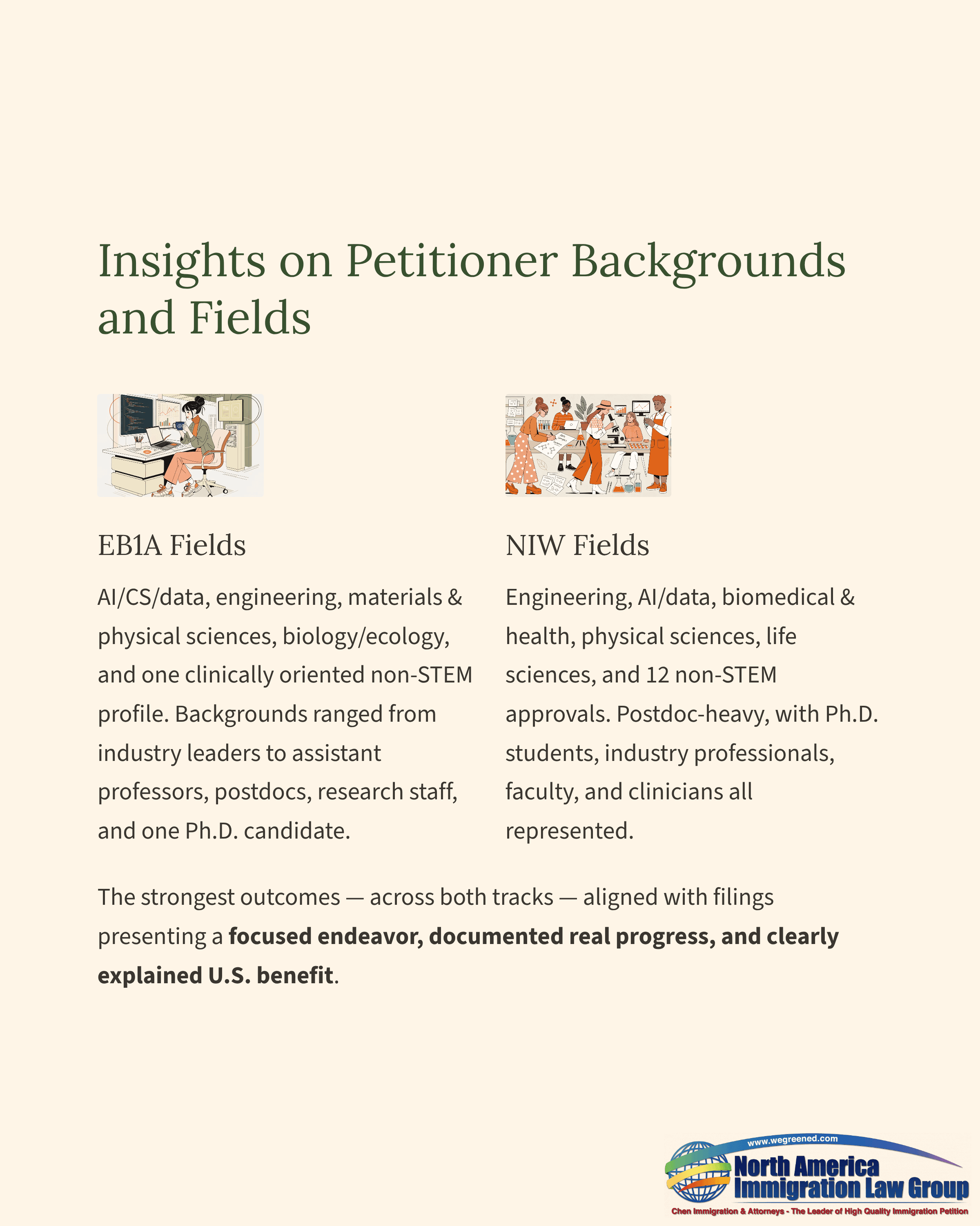 EB1A approvals this week clustered in AI/CS/data-facing work and engineering-, materials-, and physical-science-focused specialties, with additional approvals across biology/ecology and one clinically oriented non-STEM profile. Employment backgrounds again reflected a practical mix, with industry-facing leaders alongside assistant professors, postdoctoral researchers, research staff, and even one Ph.D. candidate. A notable week-specific detail is the presence of an industry-side EB1A approval in technology strategy with no publications or citations, reinforcing that EB1A is not confined to a conventional academic lane when the record can be organized into clear, externally verifiable evidence of original contributions, trusted roles, and field-level recognition.NIW approvals were again postdoc-heavy and also included a large share of Ph.D. students and candidates, industry professionals, research staff, faculty, and a smaller clinician group. Fields spanned engineering, AI/data-driven work, biomedical and health-related areas, physical sciences, and life sciences. This week also included 12 non-STEM NIW approvals, underscoring that the NIW framework remains adaptable when the petition defines the endeavor precisely and ties it to concrete U.S. needs. Across both research-track and industry-track profiles, the strongest outcomes aligned with filings that presented a focused endeavor, documented real progress, and clearly explained how a waiver supports broader U.S. benefit through flexibility and scale.