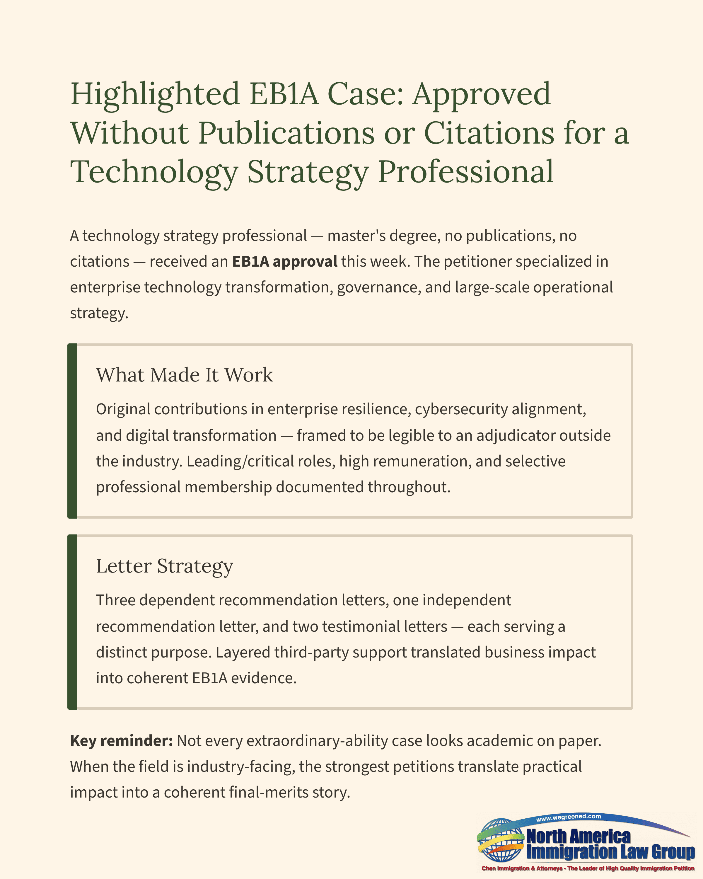 One of the most instructive approvals this week was an EB1A case for a technology strategy professional whose record did not follow the usual academic pattern. The petitioner held a master’s degree and worked in enterprise technology transformation, governance, and large-scale operational strategy. At the time of filing, the case included no publications and no citations. Even so, the petition was approved, making it a useful example of how EB1A can succeed when the evidence is organized around real-world influence rather than scholarly metrics.What made the case work was not volume-based academic evidence, but a strong showing that the petitioner’s work carried unusual significance inside major organizations and in high-stakes operational settings. The filing focused on original contributions tied to enterprise resilience, governance, cybersecurity alignment, and digital transformation, and presented those contributions in a way that made their significance legible to an adjudicator outside the industry. We also documented leading and critical roles, high remuneration, and selective professional membership to show that the petitioner was not simply performing well, but operating at a level that reflected sustained recognition in the field.