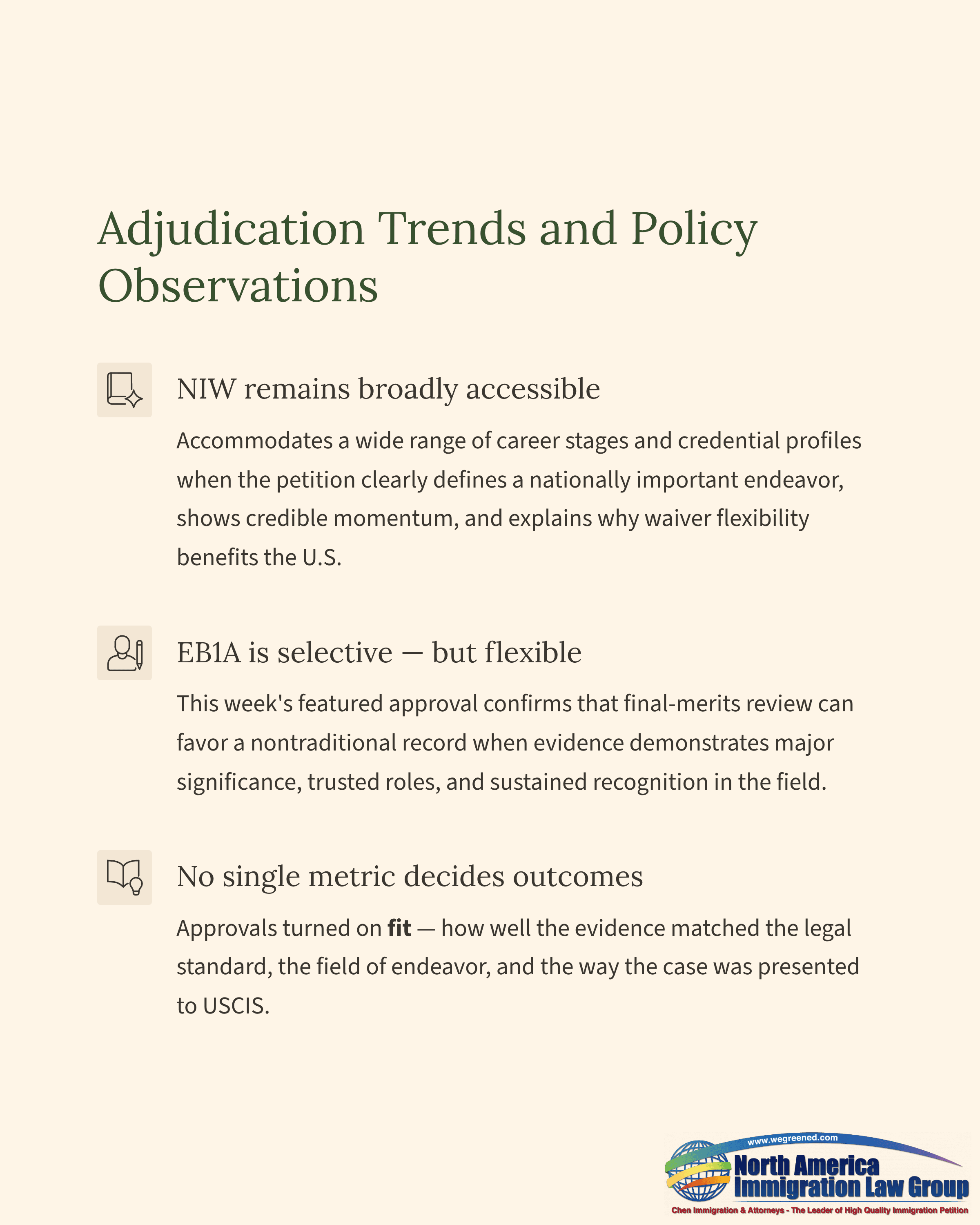 This week’s approvals reinforce a useful distinction between NIW and EB1A. NIW continued to accommodate a broad range of career stages and credential profiles when the petition clearly defined a nationally important endeavor, showed credible momentum, and explained why waiver flexibility would benefit the United States. EB1A remained the more selective category overall, but this week’s featured approval also shows that final merits review can still favor a nontraditional record when the evidence demonstrates major significance, trusted roles, and sustained recognition in the field.The practical takeaway is that approvals did not turn on any single metric. They turned on fit: how well the evidence matched the legal standard, the field of endeavor, and the way the case was presented to USCIS.