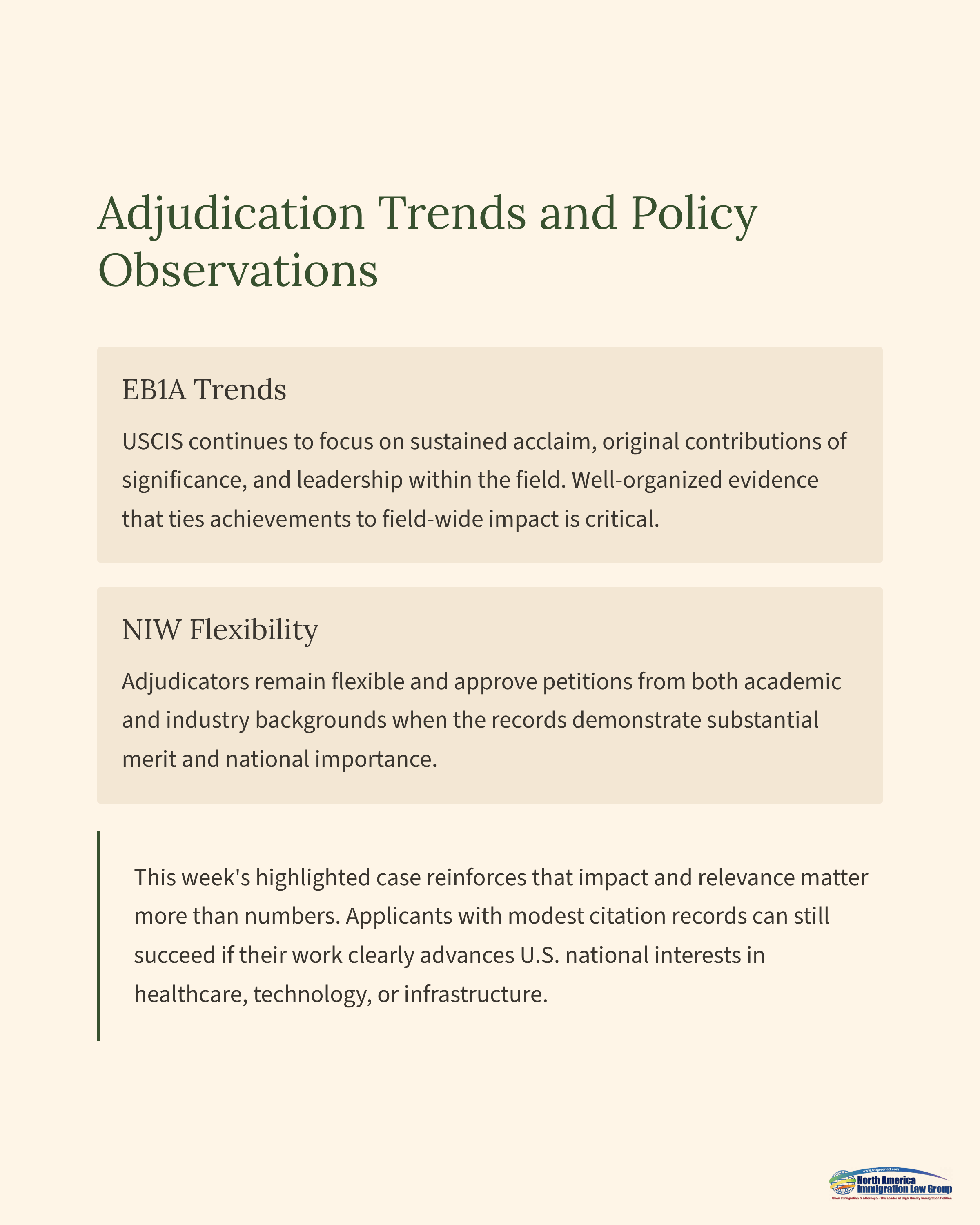 This week’s highlighted case reinforces that impact and relevance matter more than numbers. Applicants with modest citation records can still succeed if their work clearly advances U.S. national interests in healthcare, technology, or infrastructure.