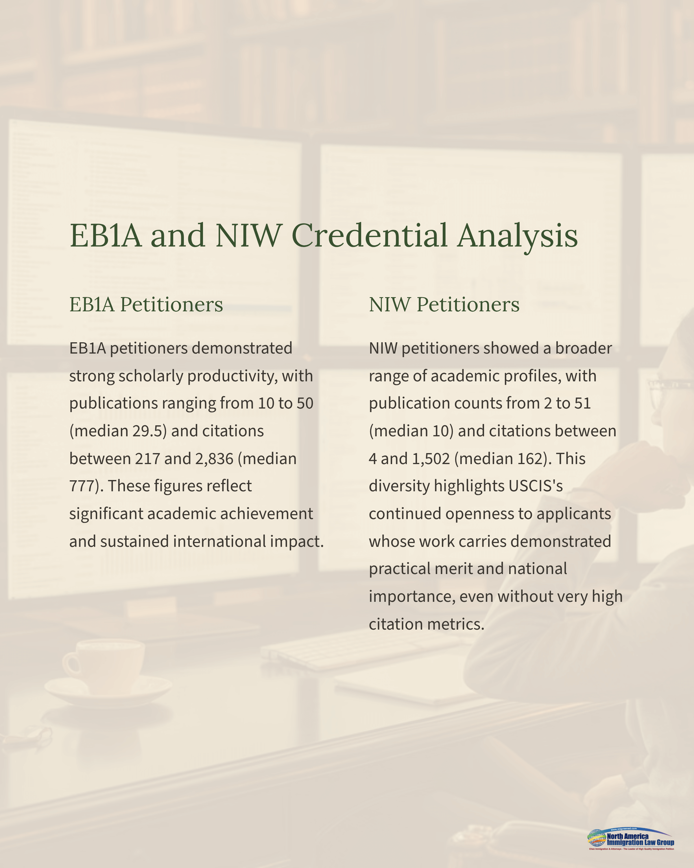NIW petitioners showed a broader range of academic profiles, with publication counts from 2 to 51 (median 10) and citations between 4 and 1,502 (median 162). This diversity highlights USCIS’s continued openness to applicants whose work carries demonstrated practical merit and national importance, even without very high citation metrics.
