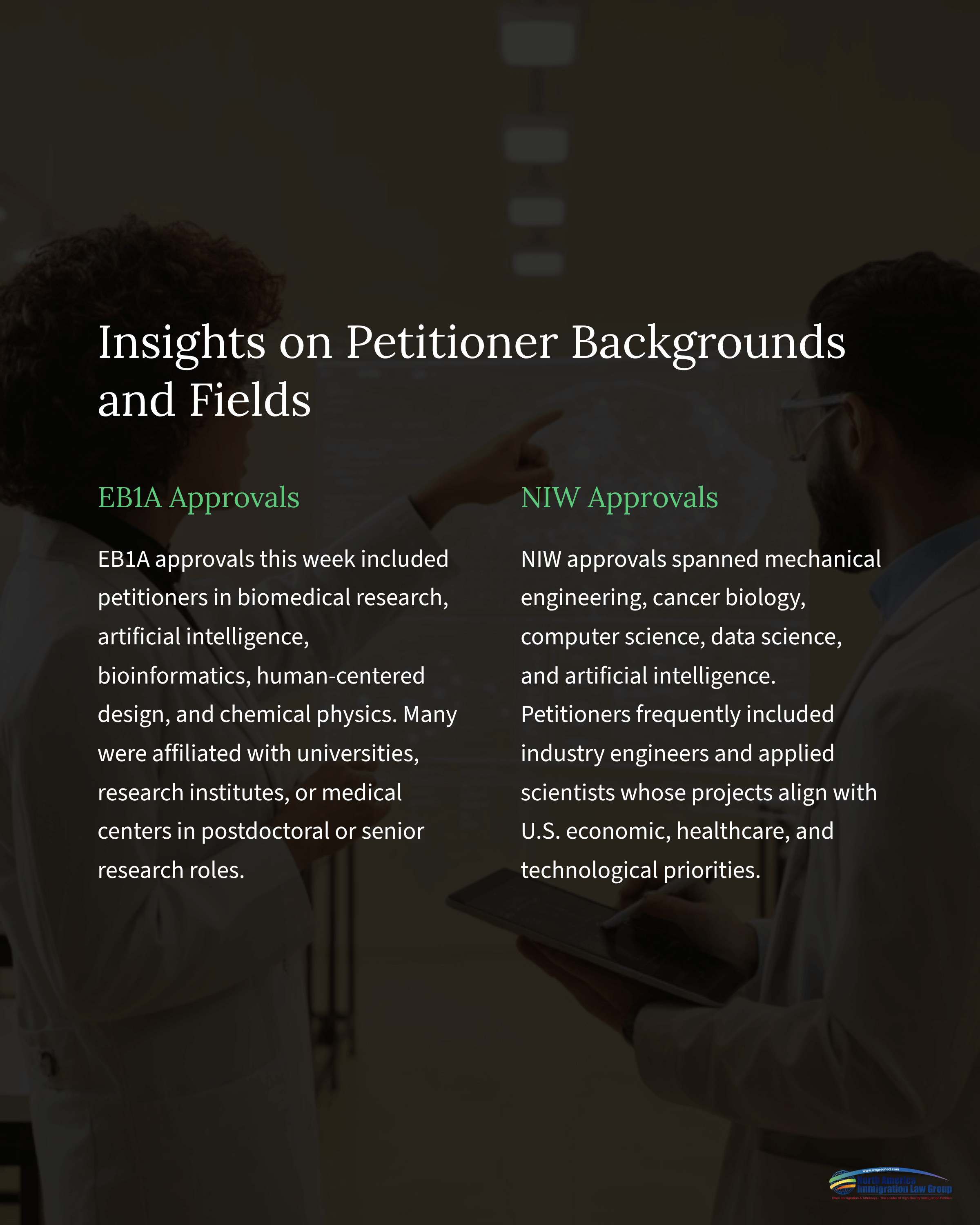 EB1A approvals this week included petitioners in biomedical research, artificial intelligence, bioinformatics, human-centered design, and chemical physics. Many were affiliated with universities, research institutes, or medical centers in postdoctoral or senior research roles.