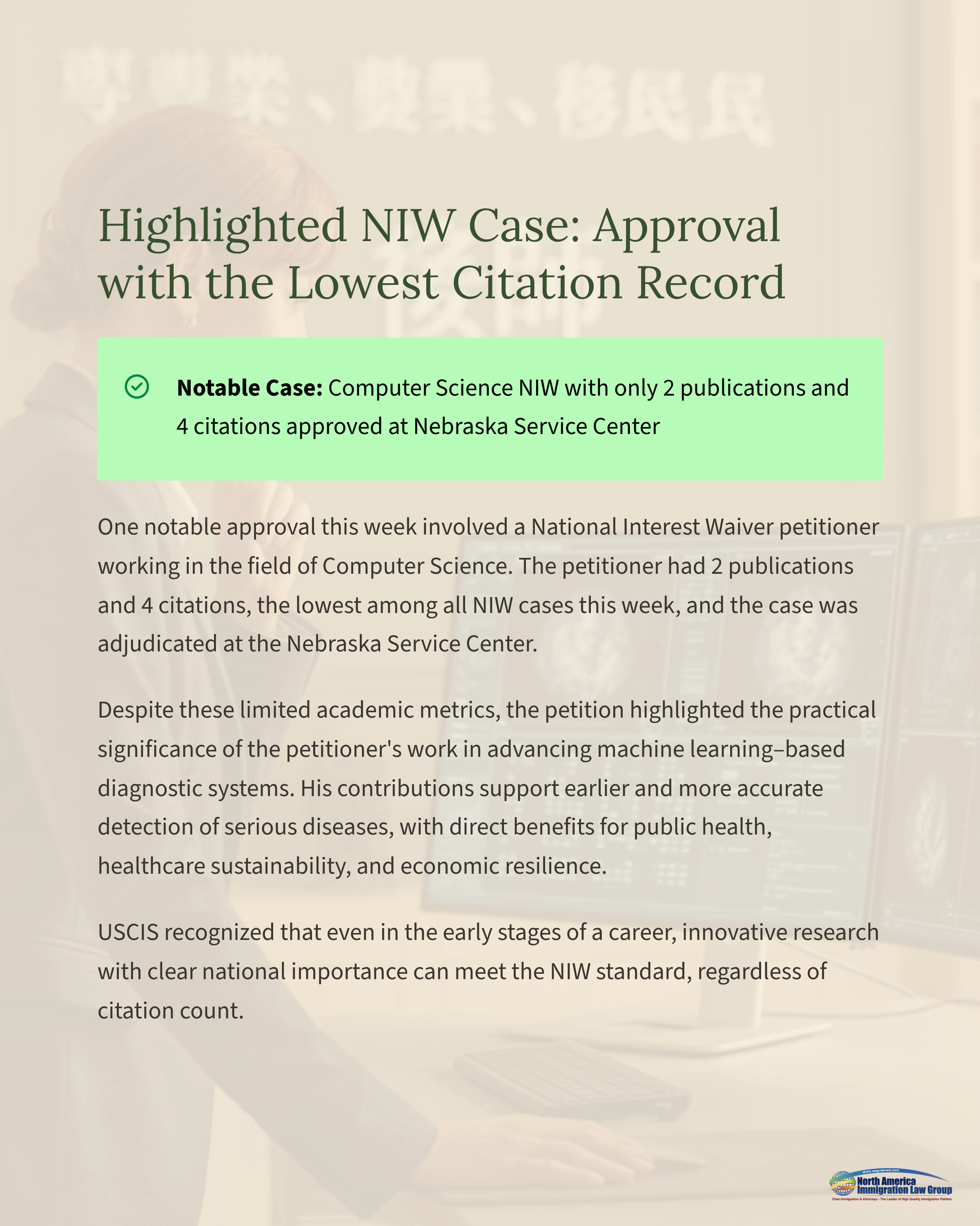 One notable approval this week involved a National Interest Waiver petitioner working in the field of Computer Science. The petitioner had 2 publications and 4 citations, the lowest among all NIW cases this week, and the case was adjudicated at the Nebraska Service Center.