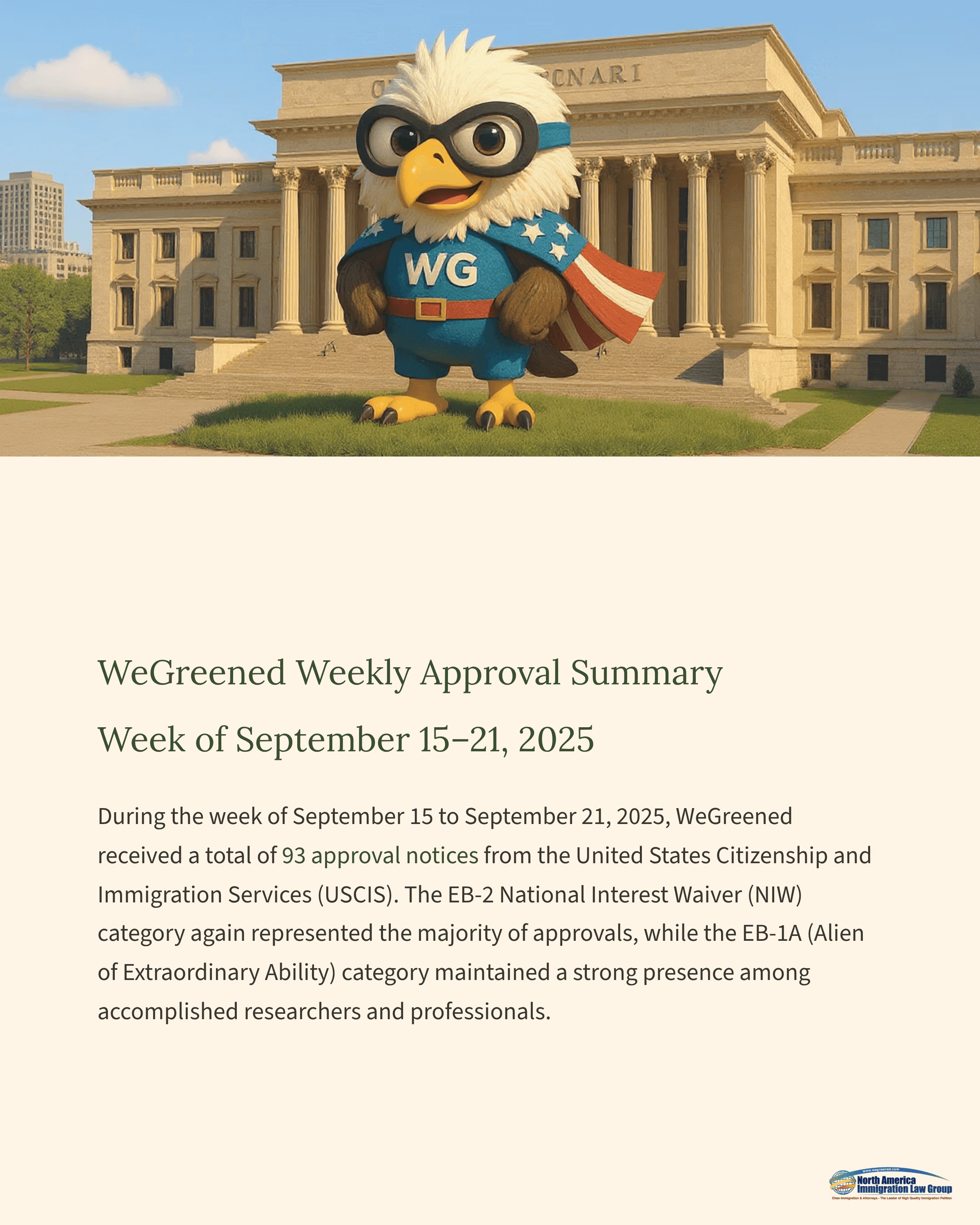 During the week of September 15 to September 21, 2025, WeGreened received a total of 93 approval notices from the United States Citizenship and Immigration Services (USCIS). The EB-2 National Interest Waiver (NIW) category again represented the majority of approvals, while the EB-1A (Alien of Extraordinary Ability) category maintained a strong presence among accomplished researchers and professionals.