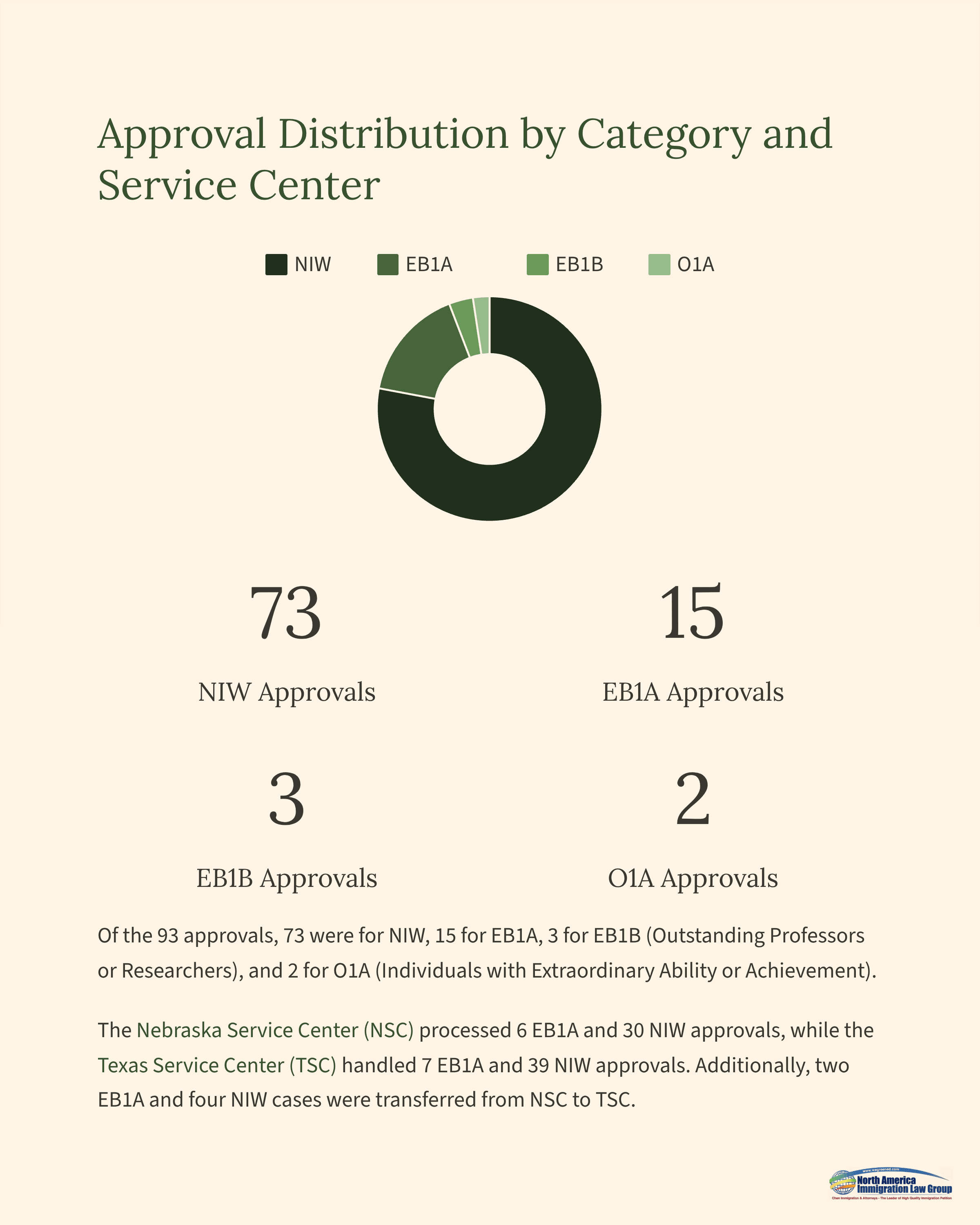 Of the 93 approvals, 73 were for NIW, 15 for EB1A, 3 for EB1B (Outstanding Professors or Researchers), and 2 for O1A (Individuals with Extraordinary Ability or Achievement).The Nebraska Service Center (NSC) processed 6 EB1A and 30 NIW approvals, while the Texas Service Center (TSC) handled 7 EB1A and 39 NIW approvals. Additionally, two EB1A and four NIW cases were transferred from NSC to TSC.