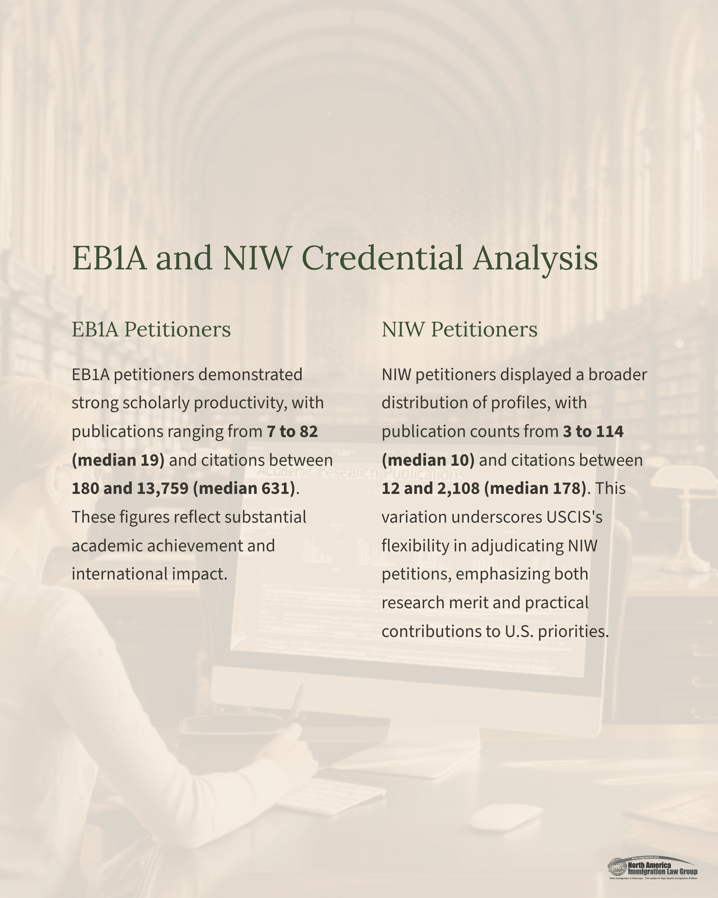 EB1A petitioners demonstrated strong scholarly productivity, with publications ranging from 7 to 82 (median 19) and citations between 180 and 13,759 (median 631). These figures reflect substantial academic achievement and international impact.NIW petitioners displayed a broader distribution of profiles, with publication counts from 3 to 114 (median 10) and citations between 12 and 2,108 (median 178). This variation underscores USCIS’s flexibility in adjudicating NIW petitions, emphasizing both research merit and practical contributions to U.S. priorities.